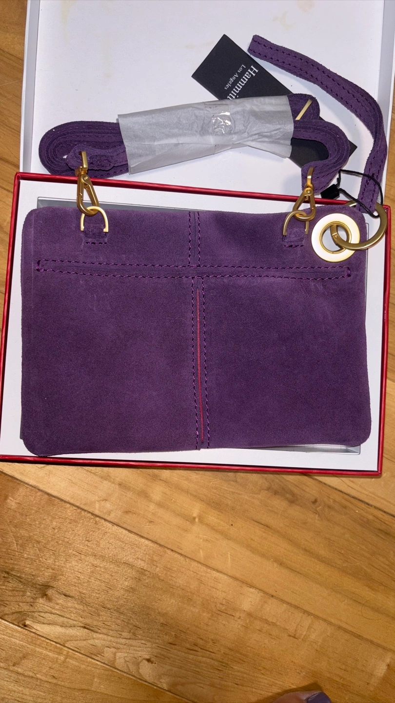 Selling a Hammitt small clutch/crossbody bag in a deep and bold purple suede, with gold accents. It comes with its original box and an extra strap. The bag is in excellent (brand new) condition, as photographed. Retail $145 USD.