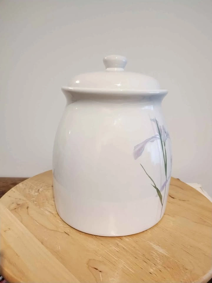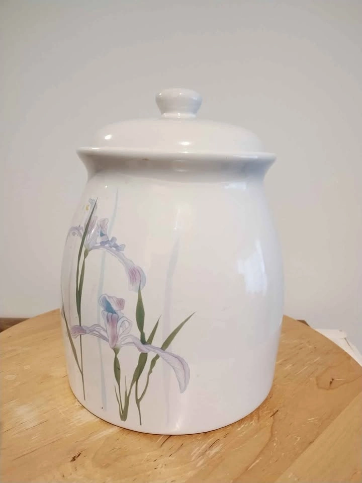 10Corelle Cookie Jar, Shadow Iris, Purple Flower, Lid with Rubber Seal, Stoneware, Vintage, 1980s, Jay Import Company Height 8 inch - 10 inch with Lid, 7.5 inch diameter ( 20.3 (25.4) x 19.05 centimetres) Meet up at Main Street Subway Station or Danforth GO Station.