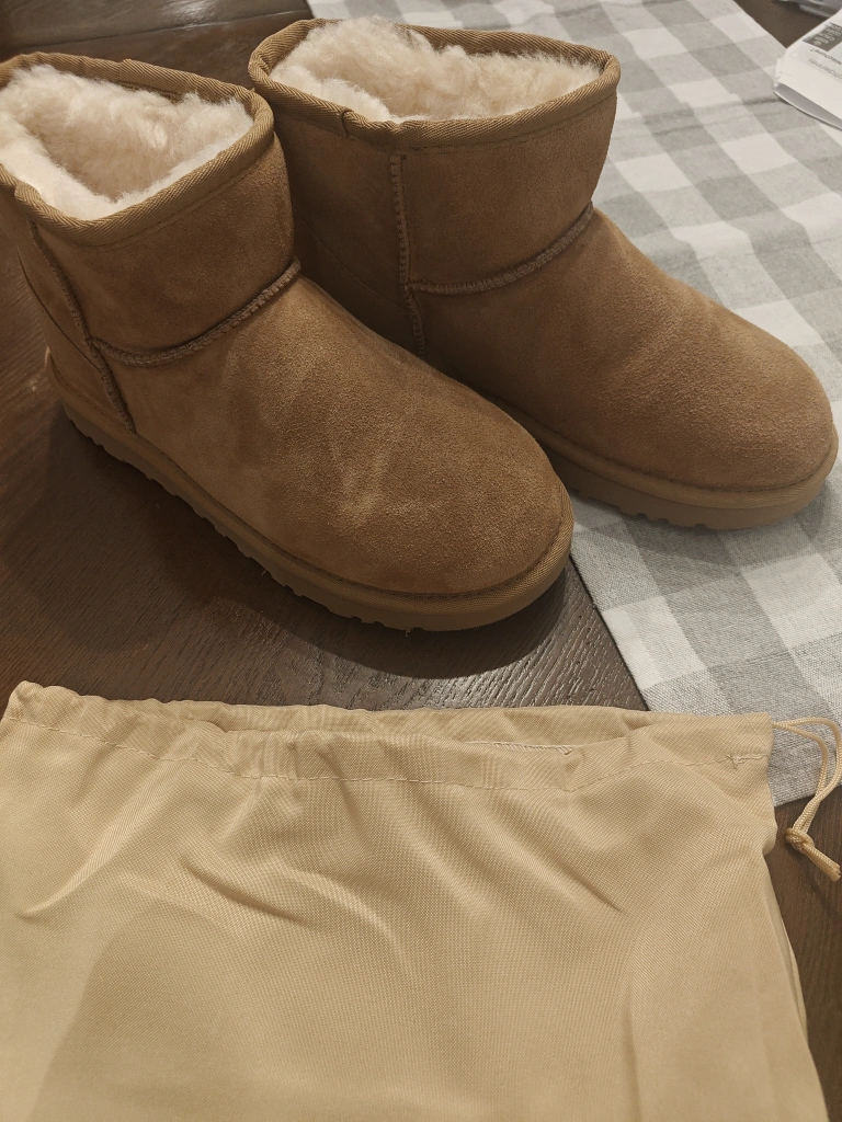 Cozy UGG Classic Mini boots in a women's size 8! These are perfect for keeping your feet warm and stylish during the colder months. Comes with the original dust bag!