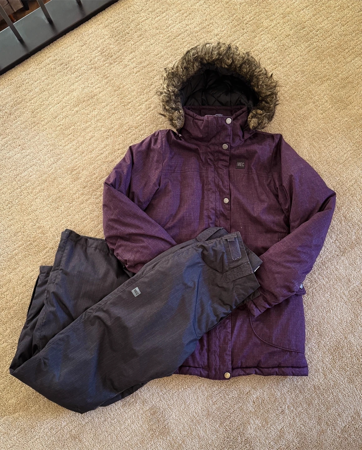 Selling a MEC snowsuit set. The jacket is a lovely shade of purple and features a faux fur-trimmed hood. The pants are a dark grey colour. Perfect for staying warm and dry during winter activities! Size 14. Cross Posted