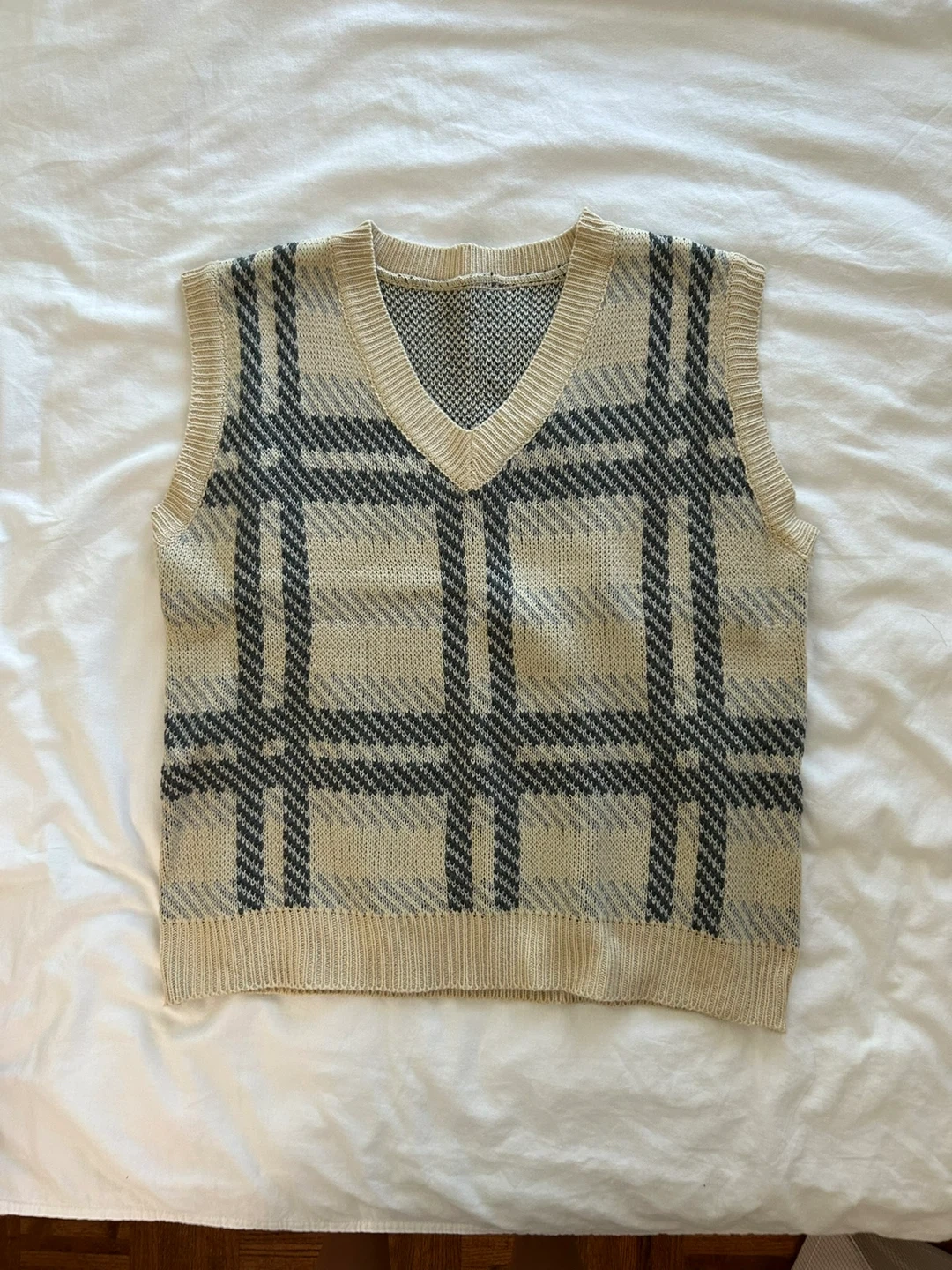 121Cozy up with this stylish plaid knit sweater vest! It's perfect for layering during the cooler months or adding a touch of preppy flair to any outfit. The neutral colour palette makes it easy to match with a variety of pieces in your wardrobe
