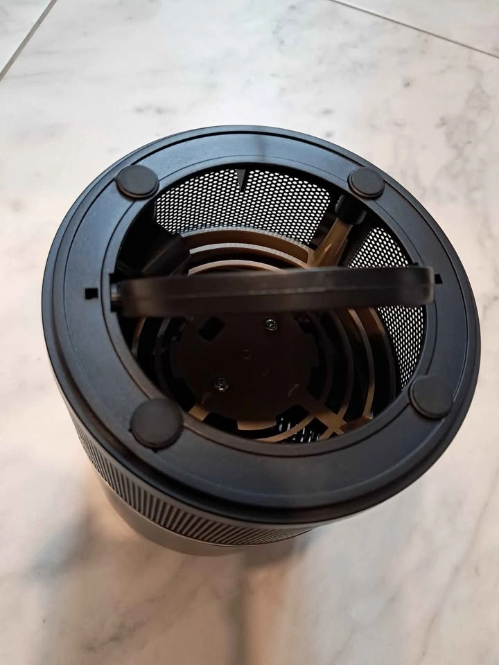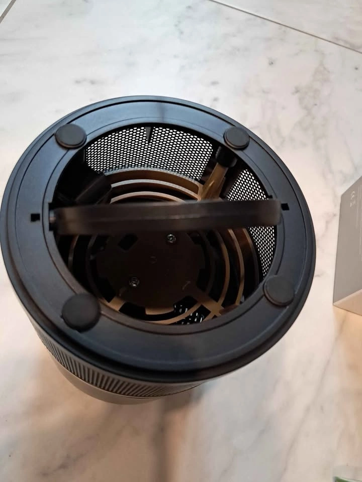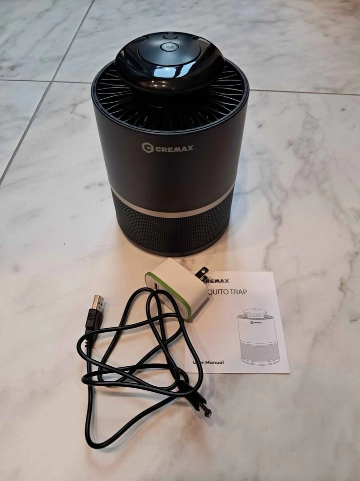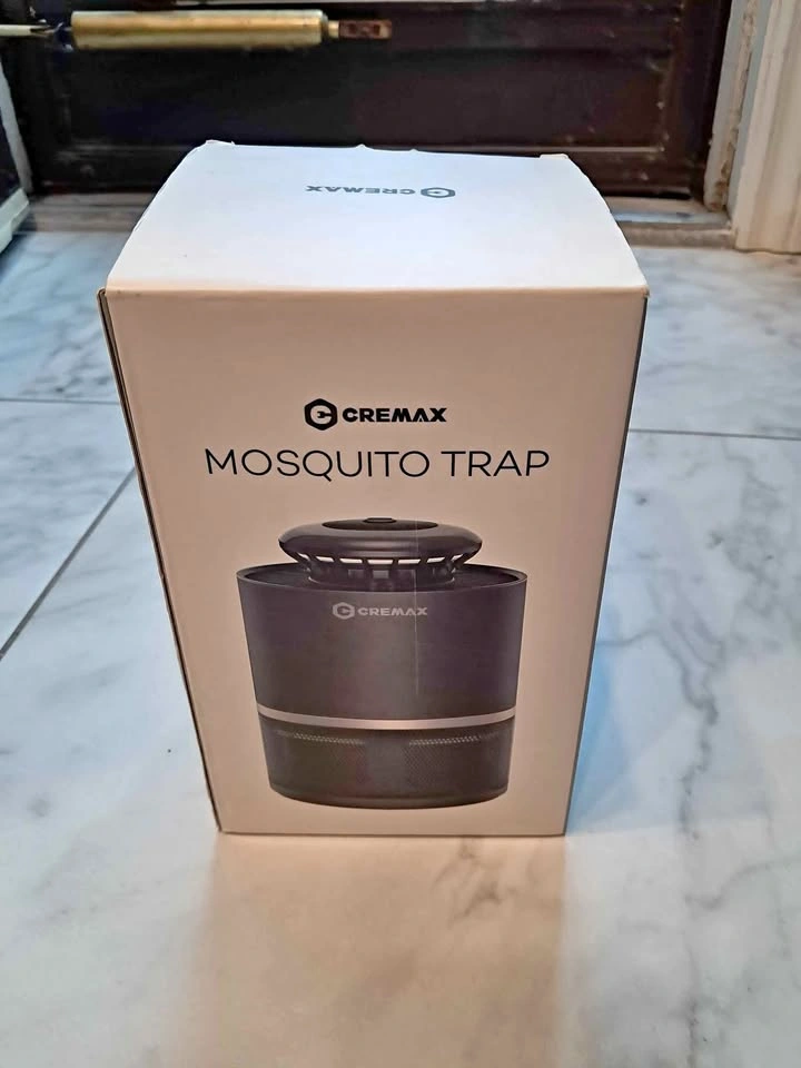 A CREMAX mosquito trap. With a black and metallic body, it appears cylindrical in shape. The trap has a handle and a mesh cover. It comes with its box, a power adapter, and a user manual.