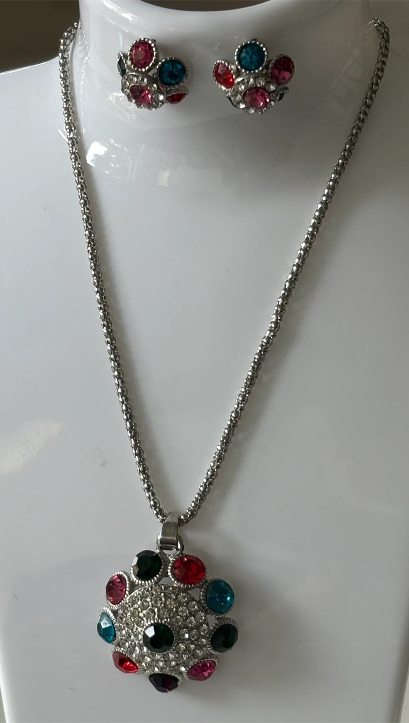 Selling a lovely necklace and earrings set! The necklace features a silver-tone chain and a pendant with colourful rhinestones. The matching earrings are clip-on style, also with colourful rhinestones. Perfect for adding a bit of sparkle to any outfit.