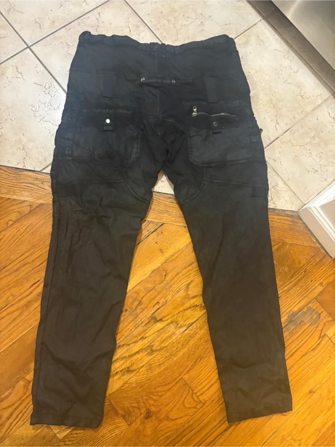 These are black cargo pants with multiple pockets and a unique design. They are in good condition and ready for a new home!