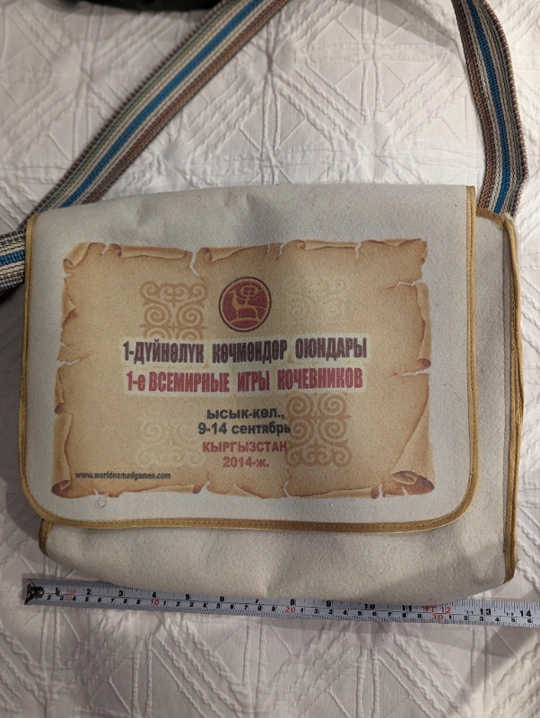 Satchel / Messenger bag - circa 2014 Nomad World Games. The 2014 World Nomad Games, officially known as the 1st World Nomad Games, was the inaugural edition held in Cholpon-Ata, Kyrgyzstan from 9–14 September 2014 with 19 sports featured in the games. While organising the first edition of the Games, the Kyrgyz government spent more than 3 million dollars.[1] More than 400 athletes from 20 countries took part in the event.