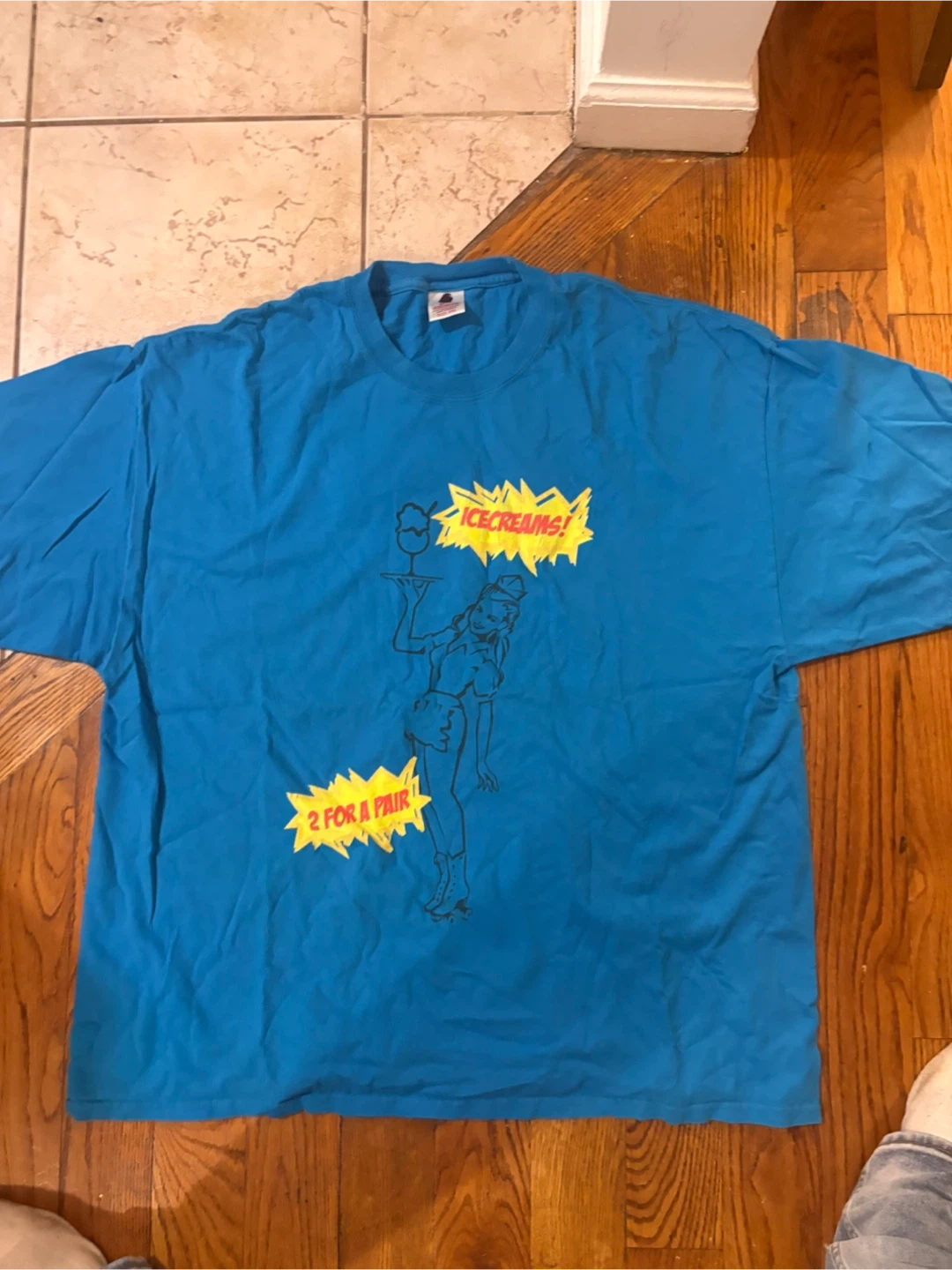 Here's a fun blue t-shirt with an ice cream design! It features the word "Ice Creams!" and the phrase "2 for a pair". It's in good condition and ready for a new home