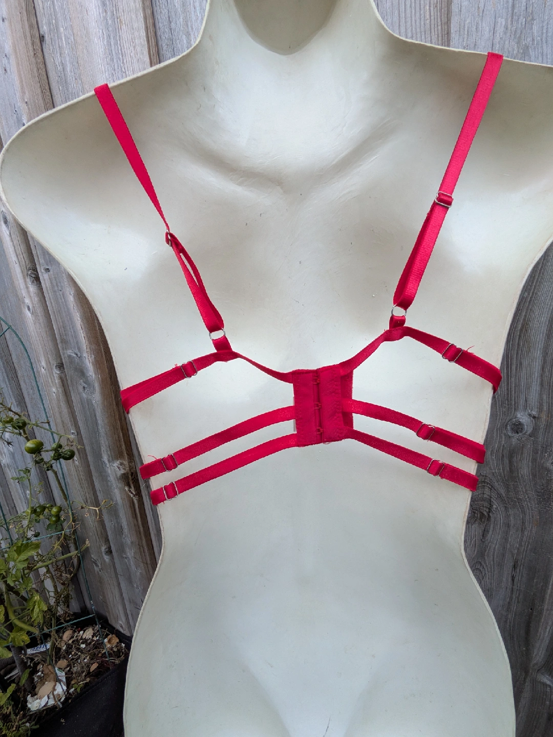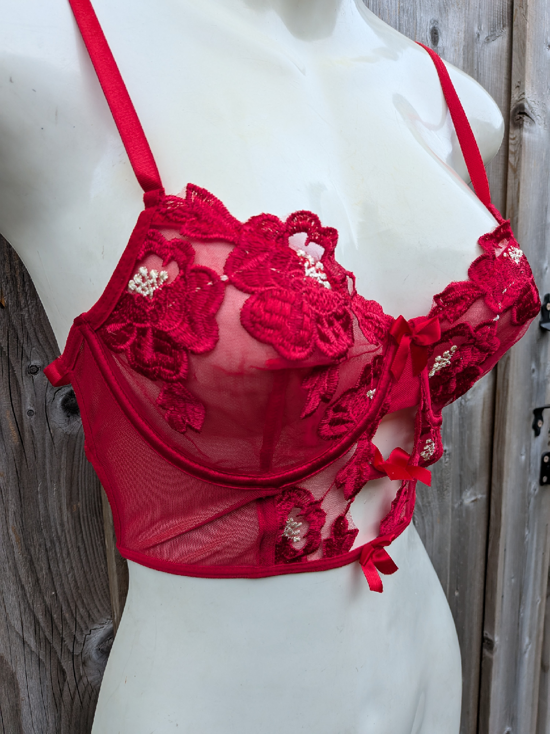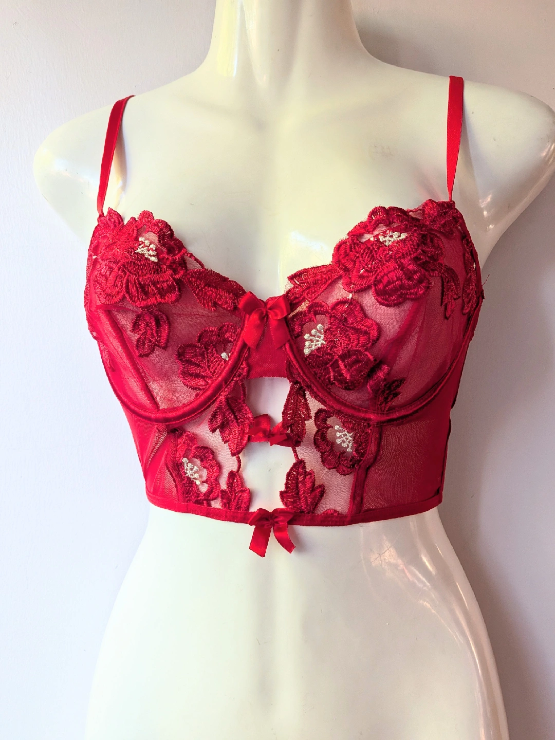 Beautiful red bustier bra with floral lace detailing! The intricate design and vibrant colour make it a standout piece. It features delicate bows and adjustable straps for a comfortable fit. Perfect for adding a touch of elegance to your wardrobe