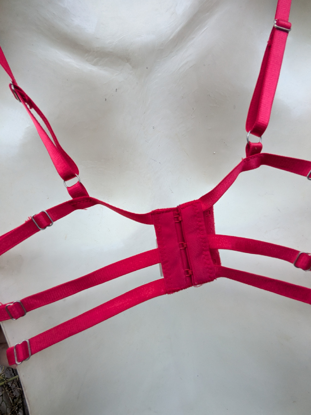** The cup size is small A or B cup. The back is ok, straps are adjustable and three sets of hook and eye