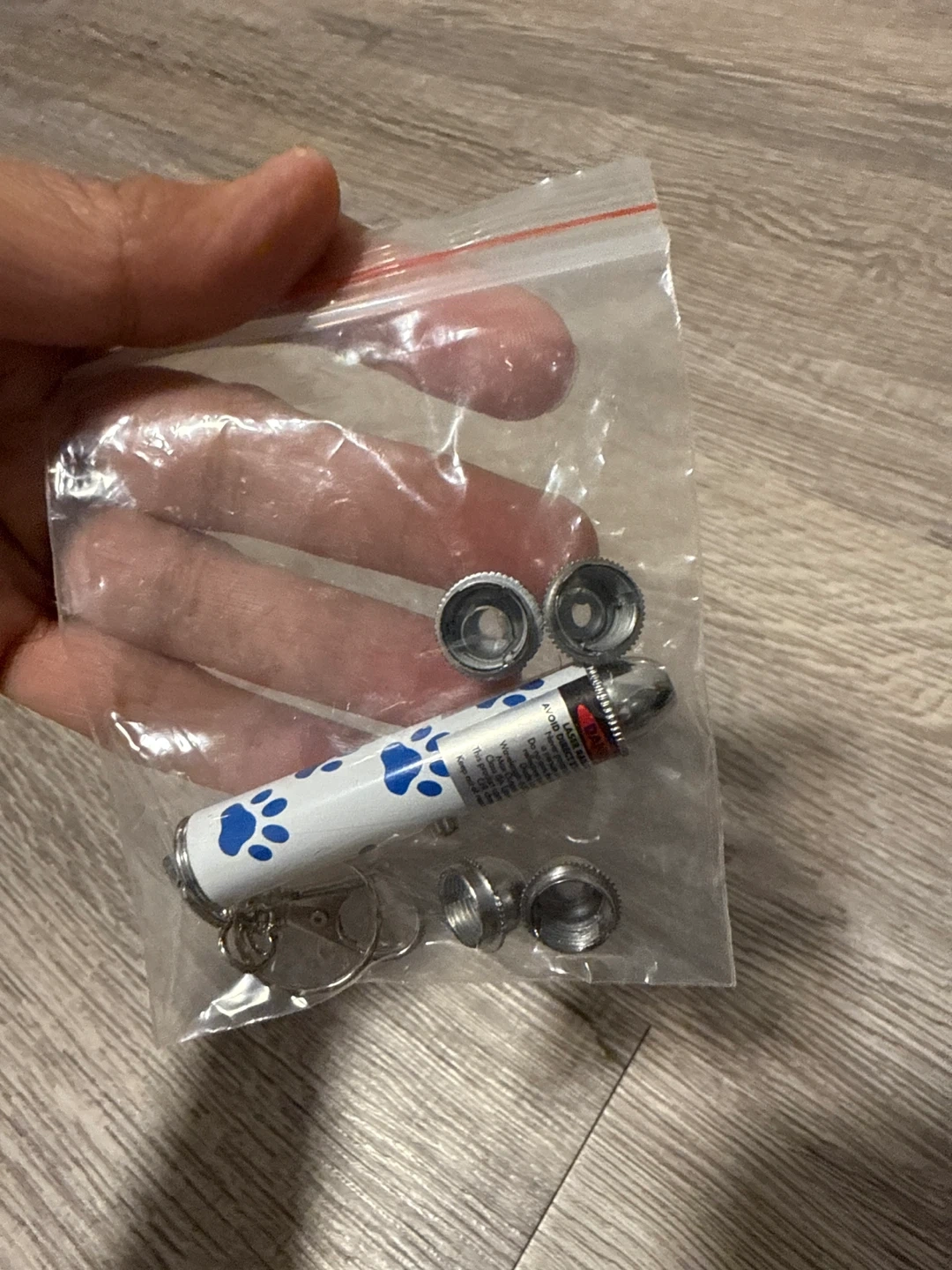 This is a pet laser pointer, perfect for playing with your furry friend! It has a cute paw print design and comes with extra attachments.