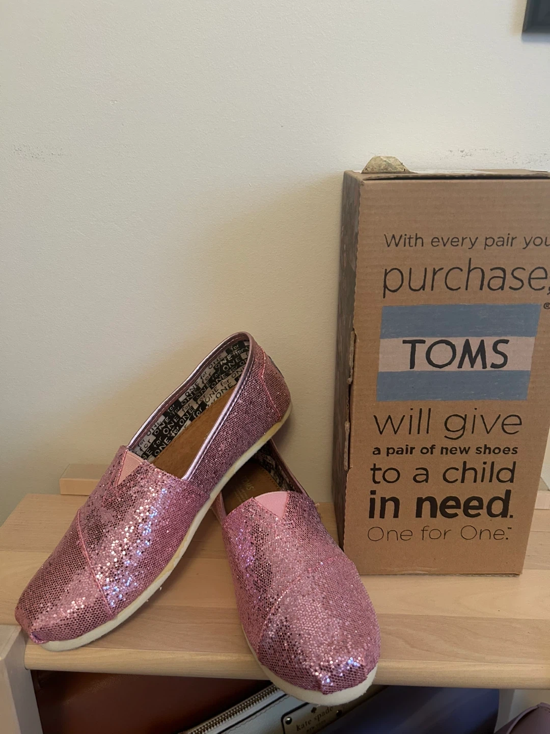 10Selling a pair of TOMS shoes in a fun pink glitter! They are kids 3.5 or women's size 6. The box is included!