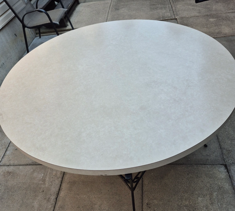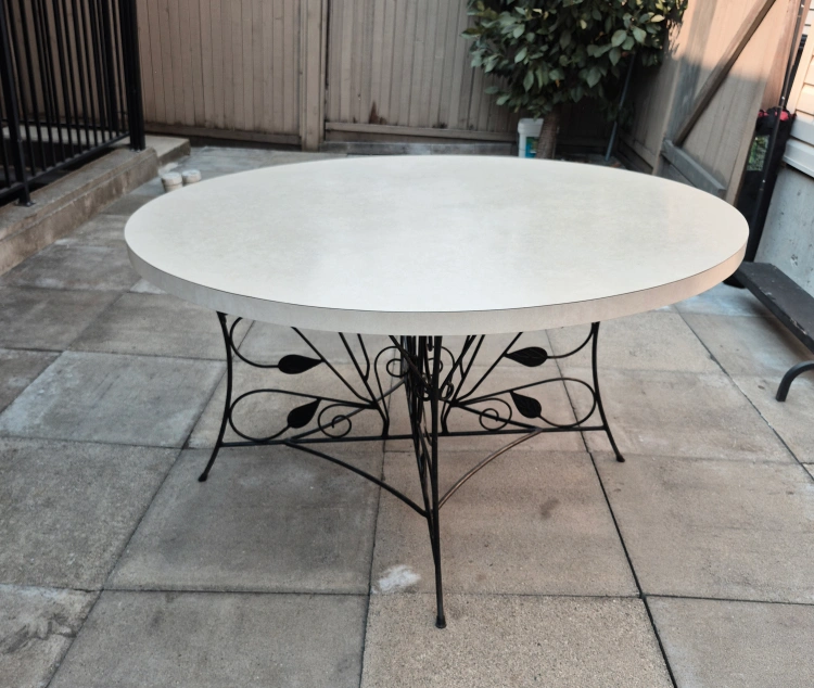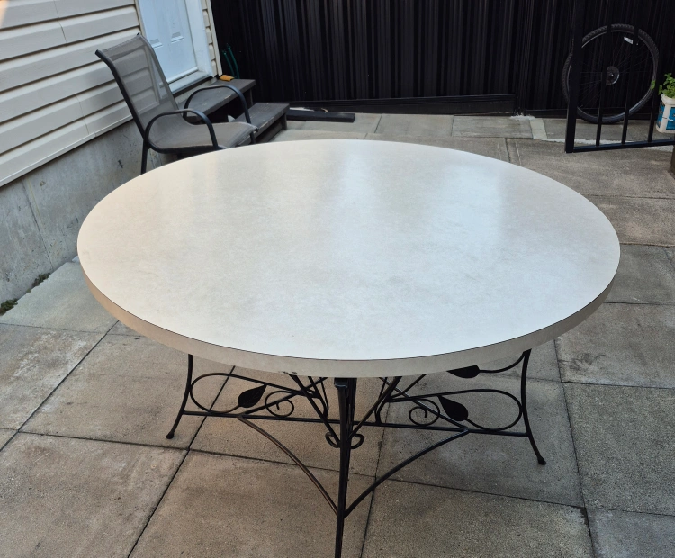 Selling a round outdoor patio table. It features a light-coloured top and a decorative black metal base with a leaf design. Perfect for your backyard or patio!