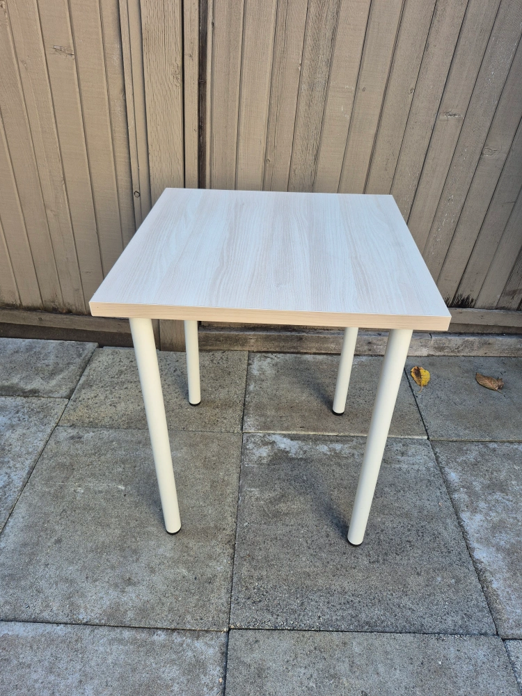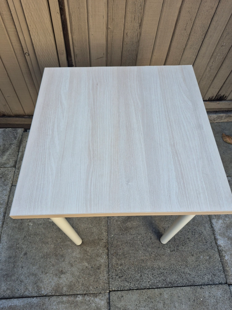Selling a small square table. It's perfect as a side table or for small spaces. The top has a light wood grain finish and the legs are white. It's in great condition and ready for a new home