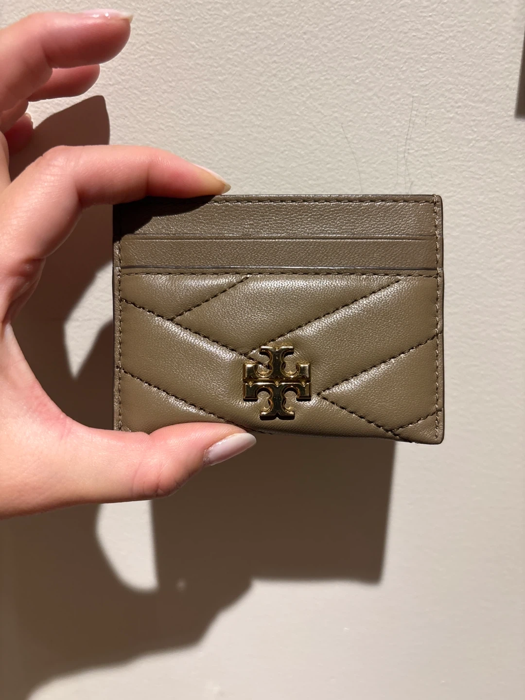 Selling a Tory Burch Kira card case in olive grey. It's in excellent condition and perfect for carrying your essential cards. Features the iconic Tory Burch logo and a quilted design. Stylish and practical!