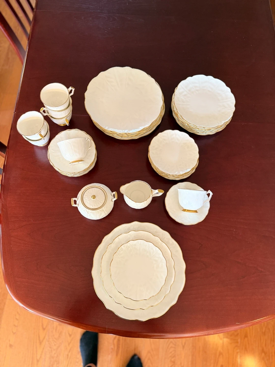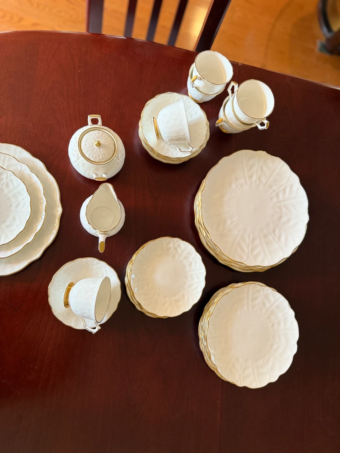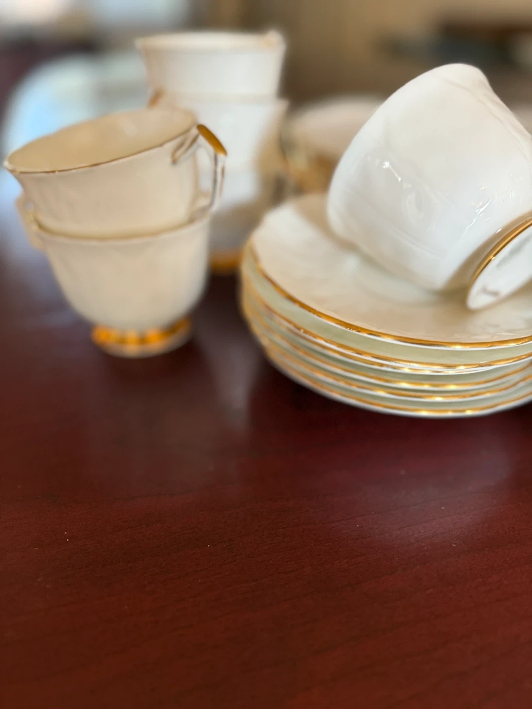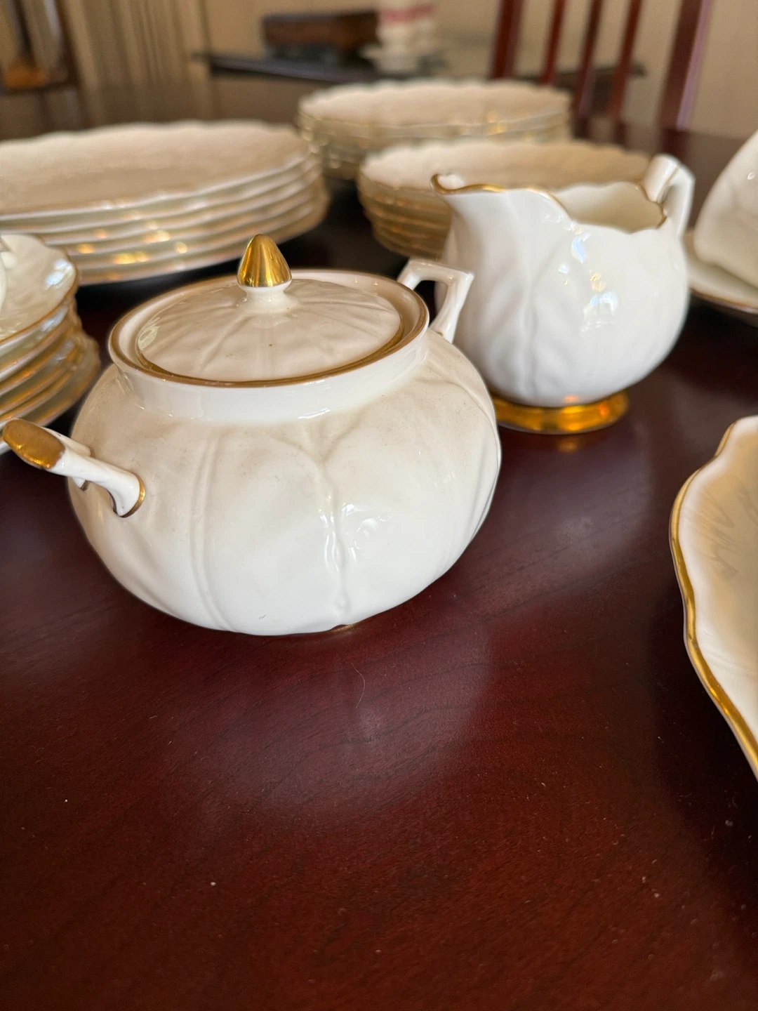 Selling a beautiful vintage china set! It includes plates, cups, saucers, a sugar bowl, and a creamer. The set is white with gold trim, adding a touch of elegance to any table setting. Perfect for special occasions or everyday use! 7 dinner plates 7 salad plates 7 bread and butter plate 7 cups and 7 saucers One sugar bowl with lid and creamer Pick up west end