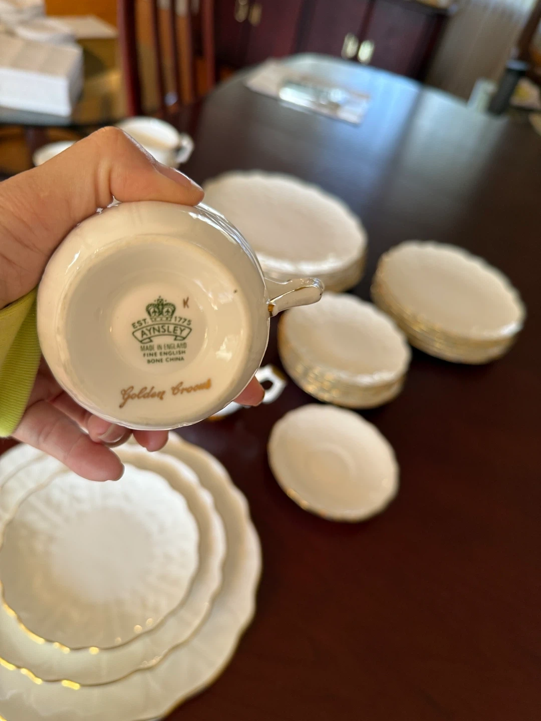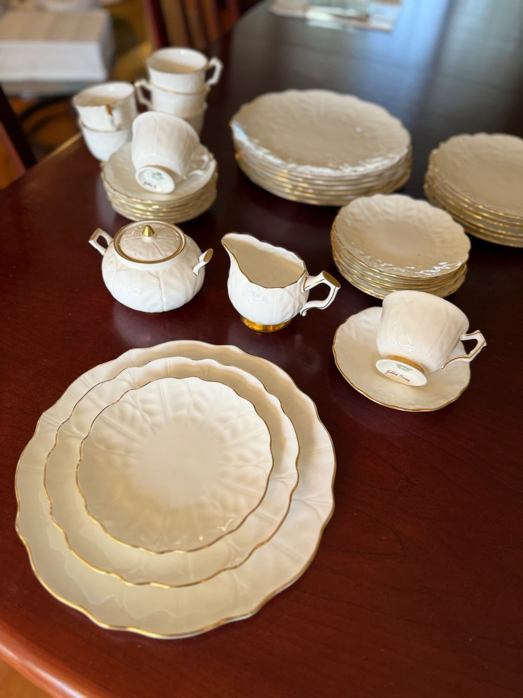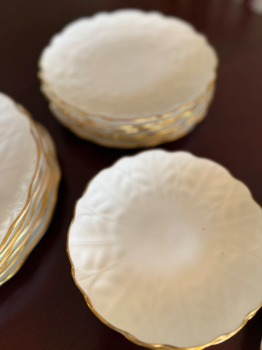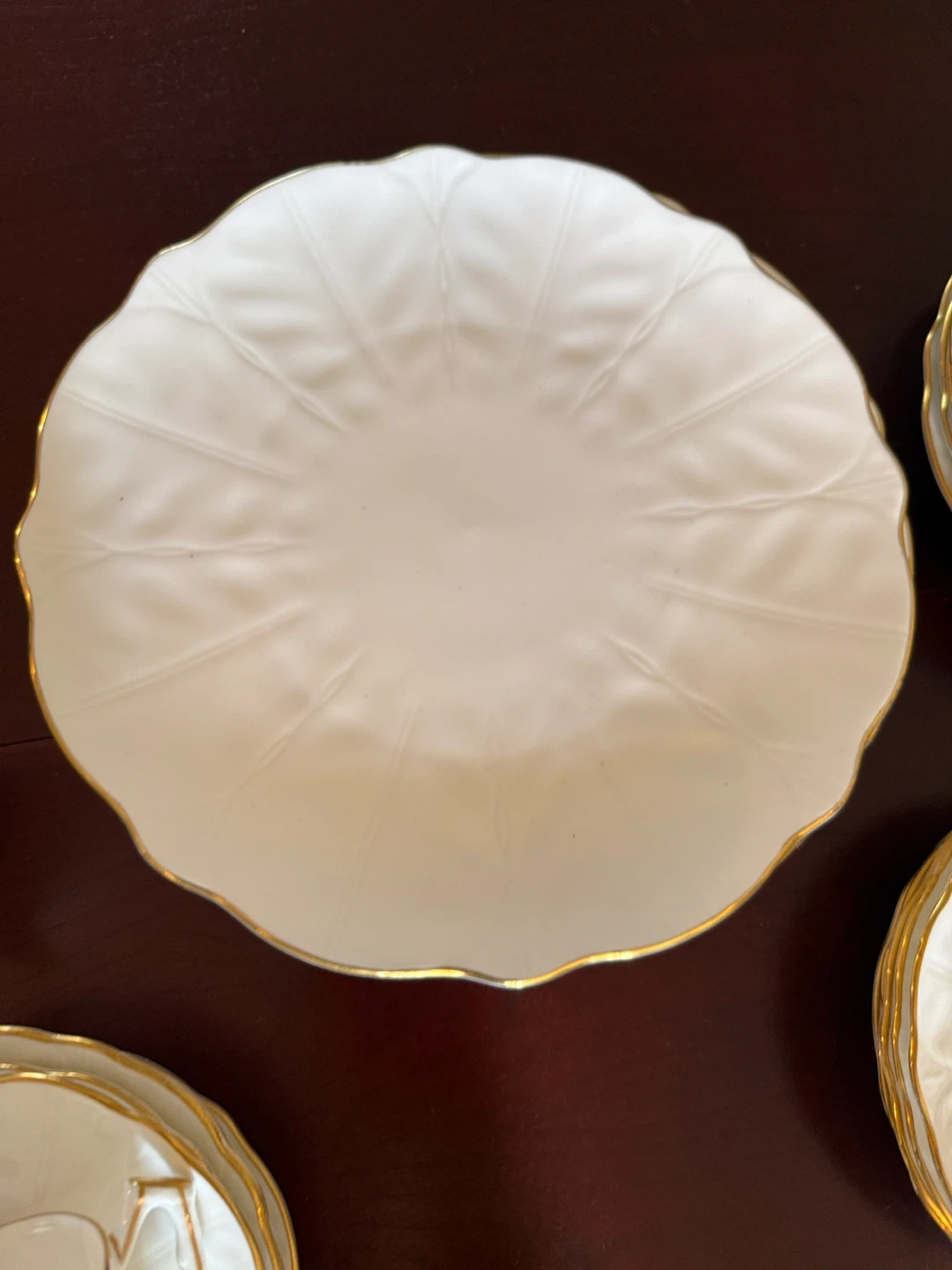 Selling a beautiful vintage china set! It includes plates, cups, saucers, a sugar bowl, and a creamer. The set is white with gold trim, adding a touch of elegance to any table setting. Perfect for special occasions or everyday use! 7 dinner plates 7 salad plates 7 bread and butter plate 7 cups and 7 saucers One sugar bowl with lid and creamer Pick up west end