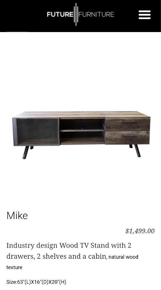 Selling New in Box solid TV Stand with 2 drawers, 2 shelves and a cabin, natural wood texture. It is 63 inches long, 16 inches deep, and 20 inches high. Originally bought for $1,499.00