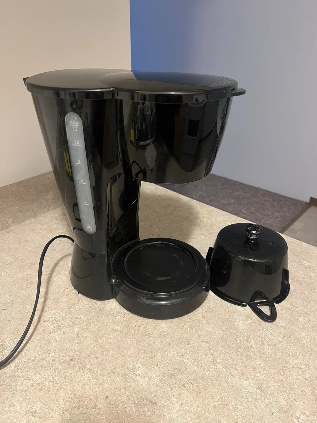 65Selling a black coffee maker with a 12-cup capacity.