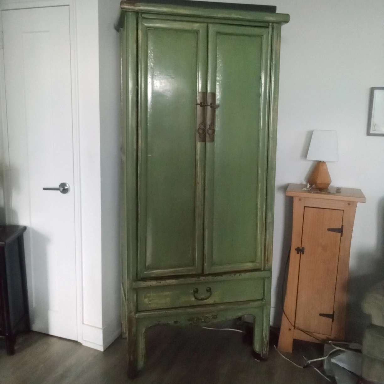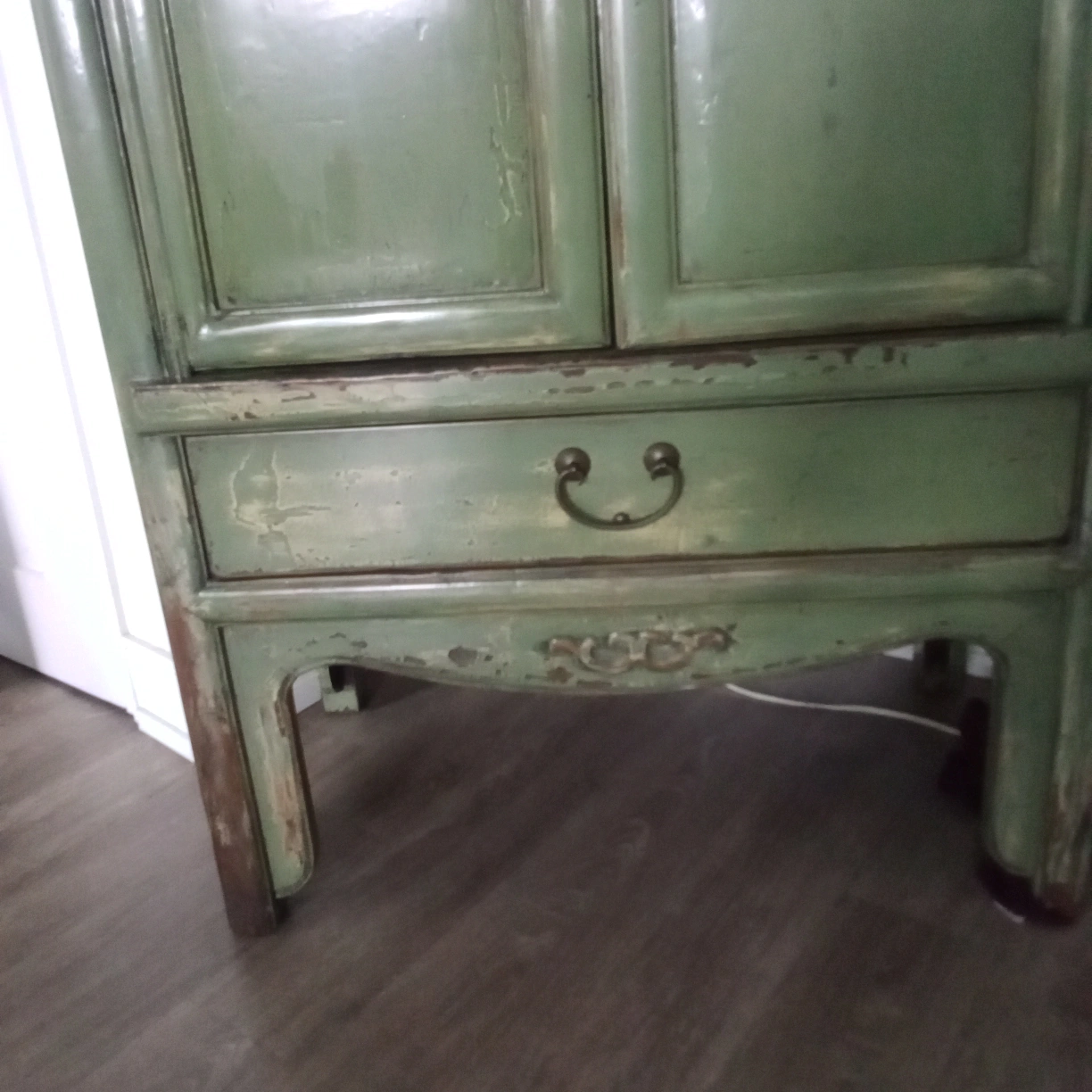 123Selling a unique, antique late 19th century Qing moss green distressed armoire It features detailed hardware and a drawer at the bottom for extra storage. A great piece to add character to any room!