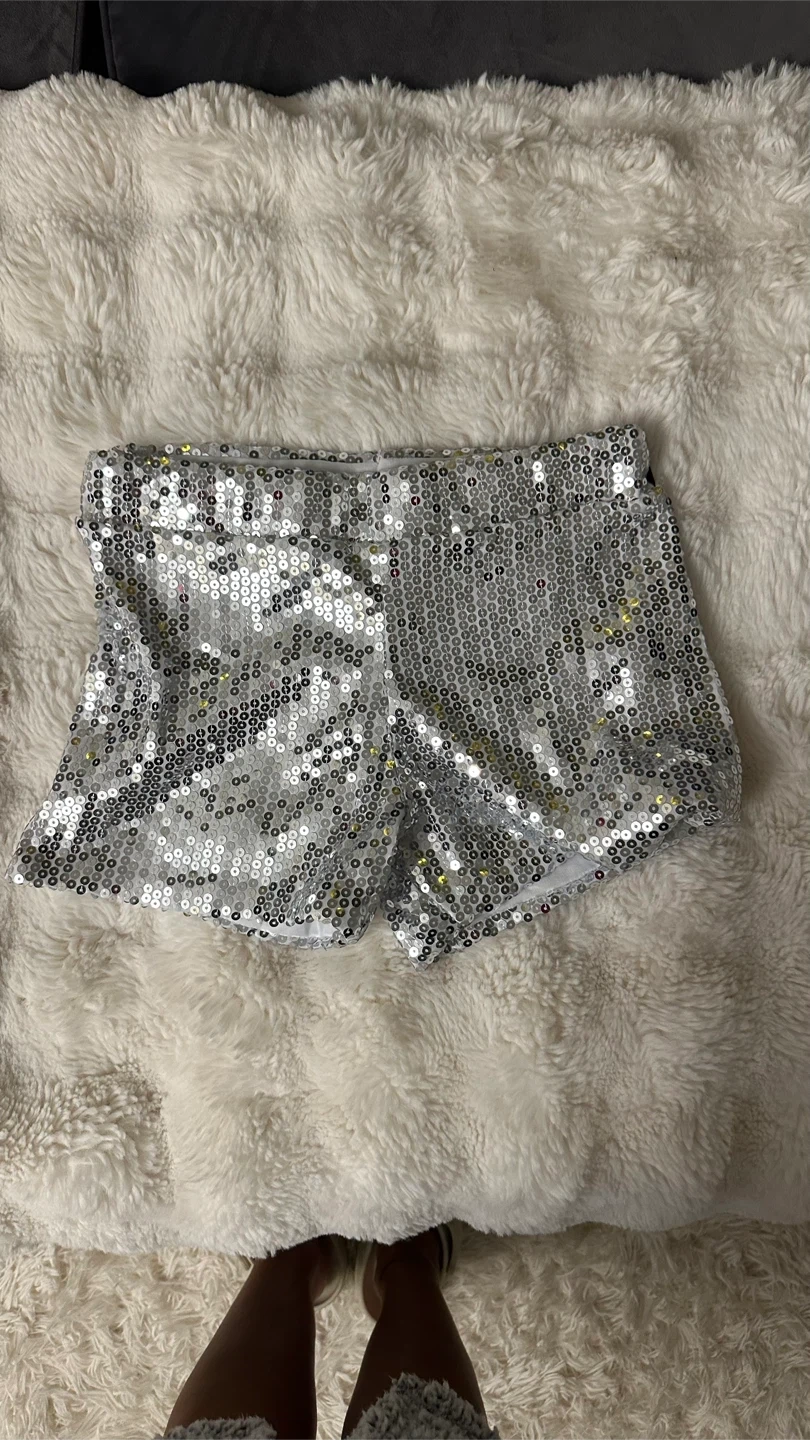 Brand new silver sequin shorts! These shorts are perfect for adding a bit of sparkle to your wardrobe. Can be used for a costume or for a night out!