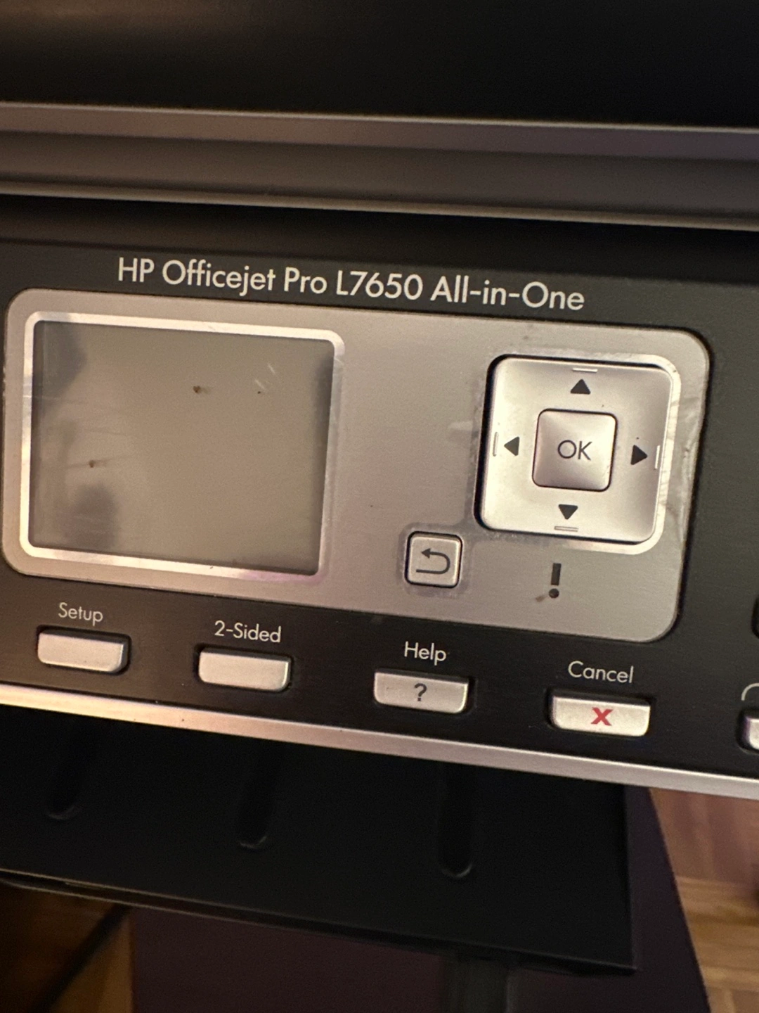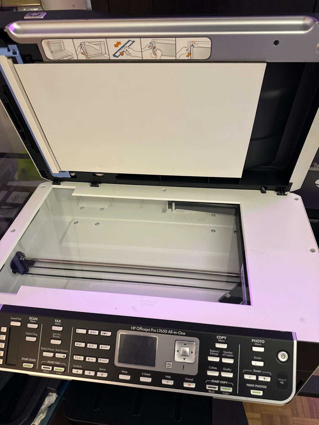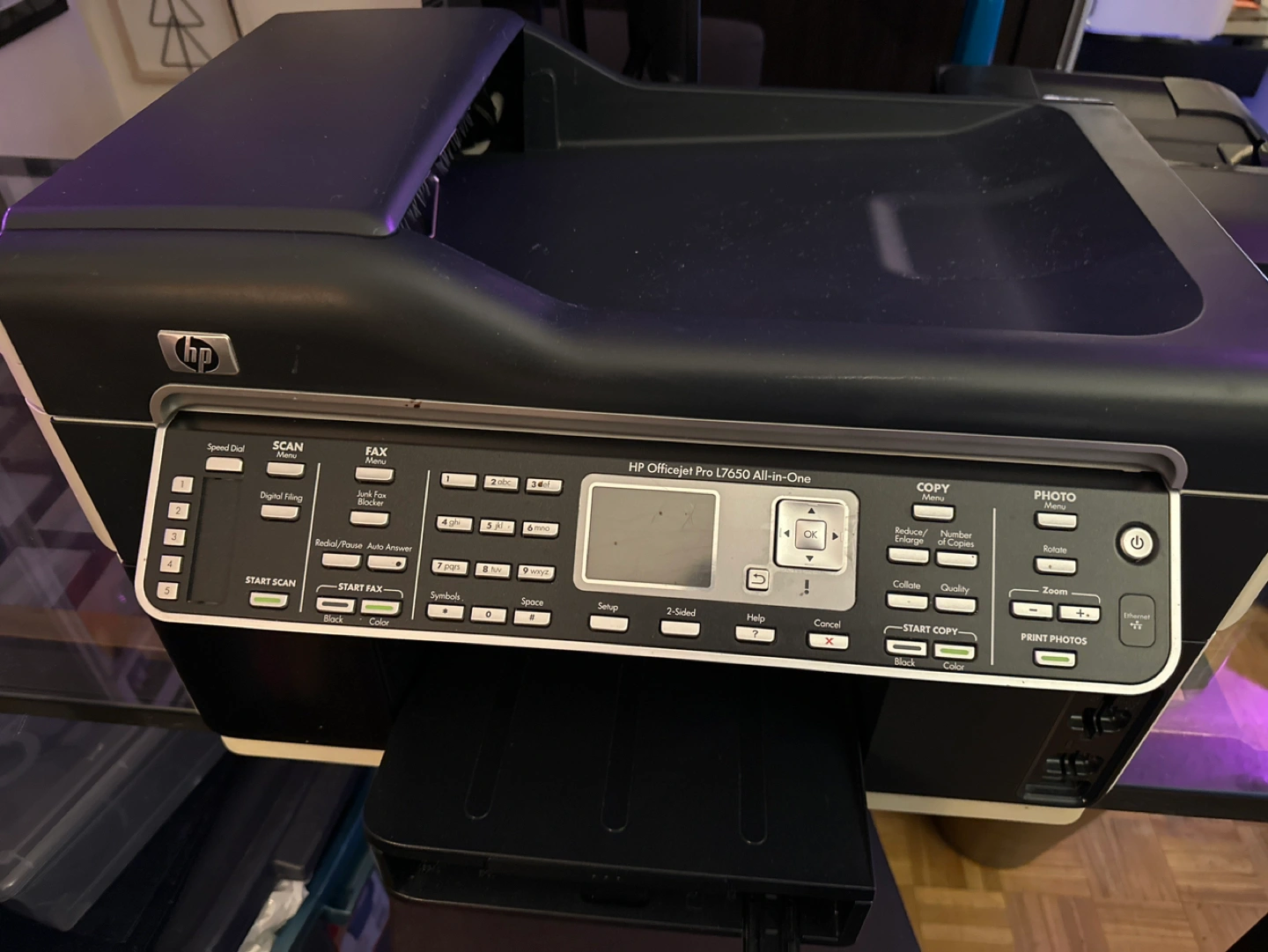 Please note: no powercord/ no ink Works fine. Manual can be found online via HP DetailsDetails Brand HP Connectivity Technology Ethernet;USB Cable;Wireless Printing Technology Laser Special Feature Network Ready Recommended Uses For Product Office, Home Printer Output Color Print media Paper (plain) Scanner Type Flatbed Max Input Sheet Capacity 250 Compatible Devices PC The HP Officejet Pro L7650 All-in-One series features the world’s fastest desktop all-in-one for business color. (1) As a result, you can print professional-looking documents at Laser Quality Speeds: up to 10 pages-per-minute (ppm) in color. With a cost-per-page that’s up to 25 percent lower than comparable laser all-in-ones, HP made high-quality printing more affordable for cost-conscious small businesses. In fact, you can print for as low as 6.0 cents per color page, so you can think less about cost and more about creating the most colorful and impactful marketing materials with HP Vivera inks. Other innovative features also work to boost productivity and efficiency around the office. The embedded wired and wireless networking, and Direct Digital Filing features available on some models within the HP Officejet Pro L7650 All-in-One series enable you to quickly capture, share and manage documents. With 2,400 dpi CCD optical resolution flatbed scanning, you can preserve documents, photos and even three-dimensional objects. And, the 350-sheet second paper tray – included on some models and an available option on all – makes printing higher volumes a snap.