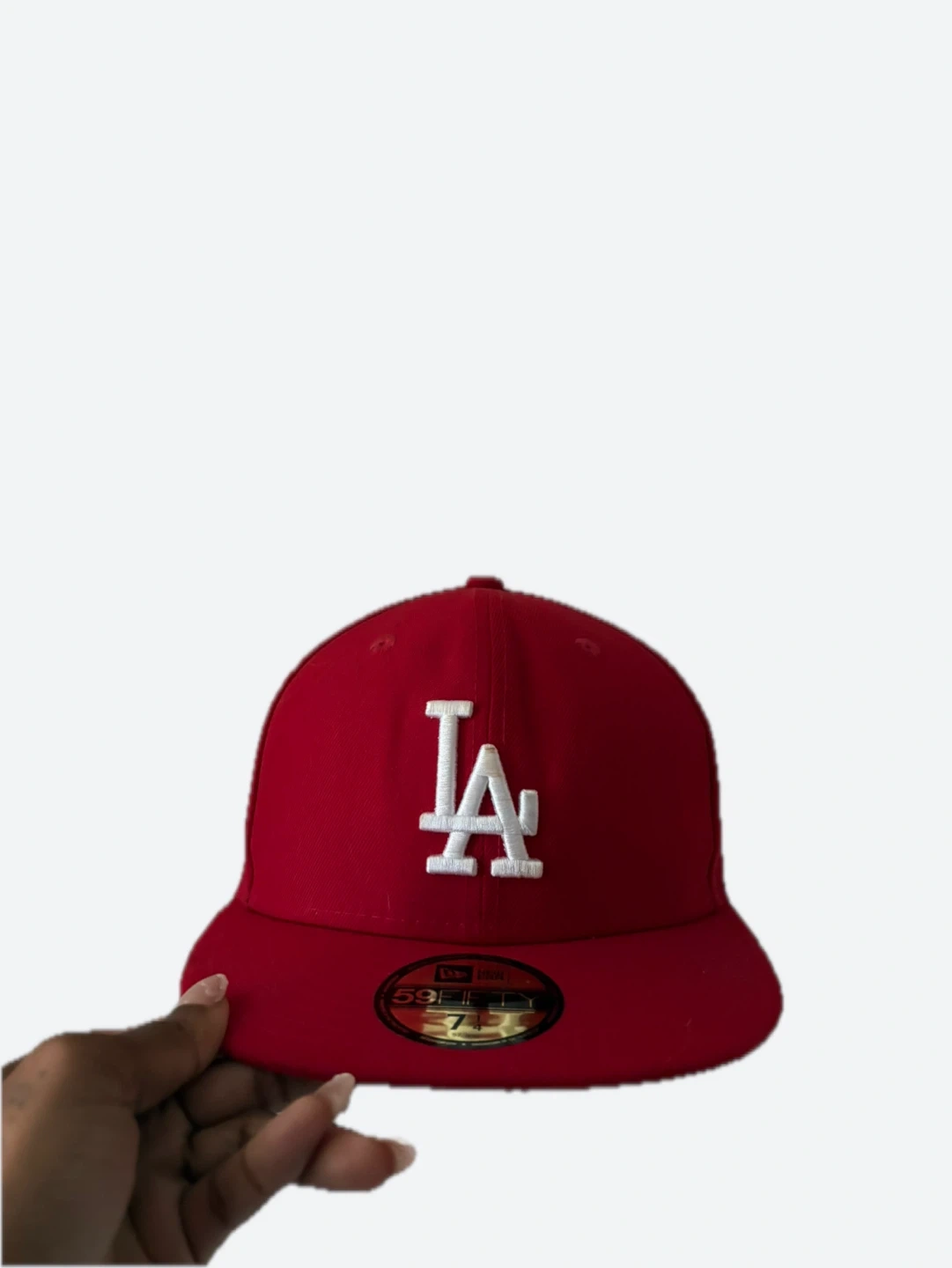 Selling a New Era LA Dodgers fitted hat in red. It's a size 7 1/4 and in excellent condition. The classic LA logo is embroidered in white, making it a stylish addition to any outfit!