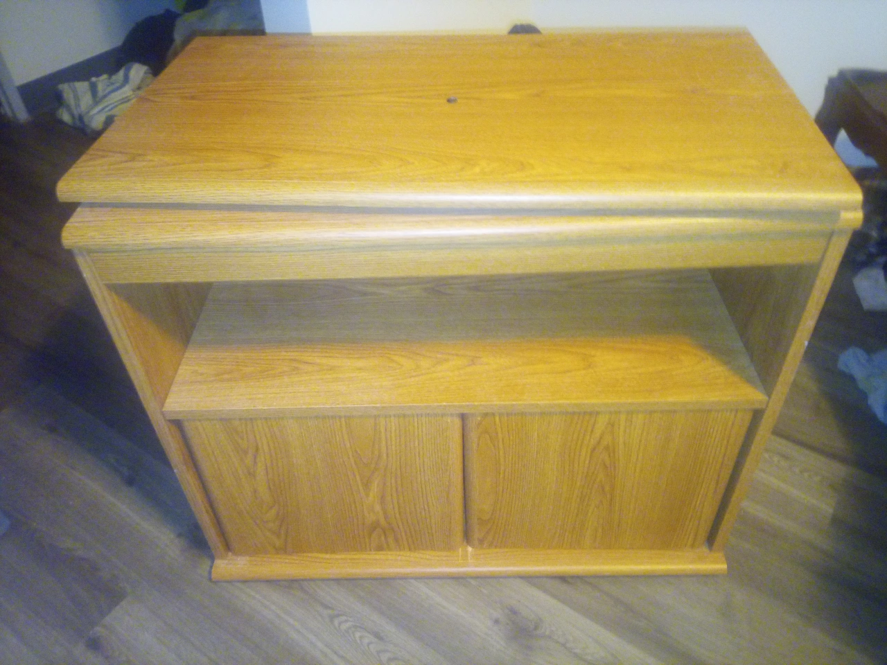 Selling a sturdy TV stand or entertainment unit. It features an open shelf and a cabinet with doors for storage. Perfect for your living room or entertainment area!