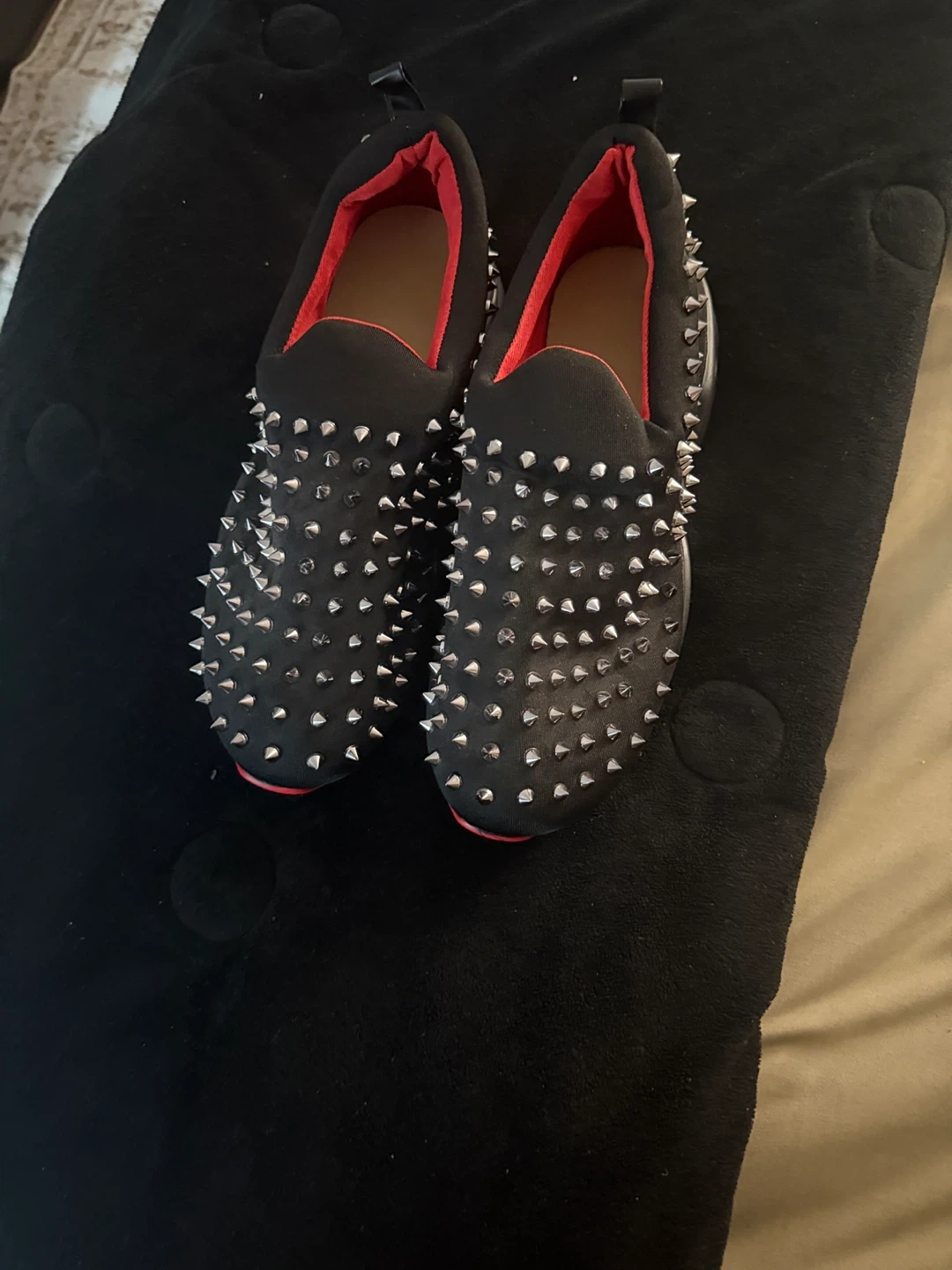 Selling a pair of slip-on shoes with a unique spiked design. These shoes are sure to make a statement with their bold look and signature red sole. Perfect for adding some edge to your wardrobe!