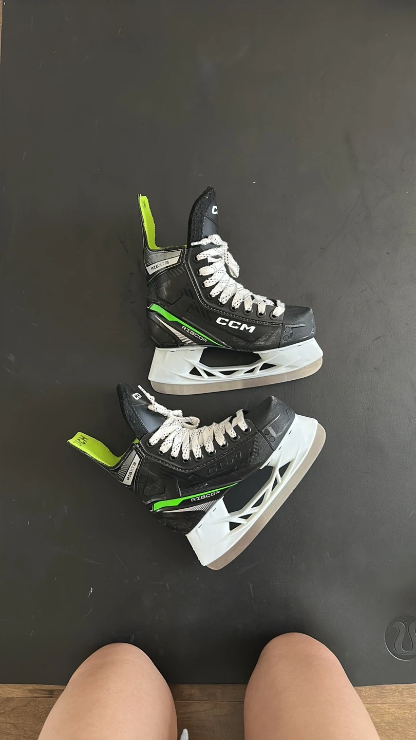 Selling a pair of CCM Ribcor ice hockey skates. Size US 2. They are black with green accents and in good condition. Perfect for hitting the ice!