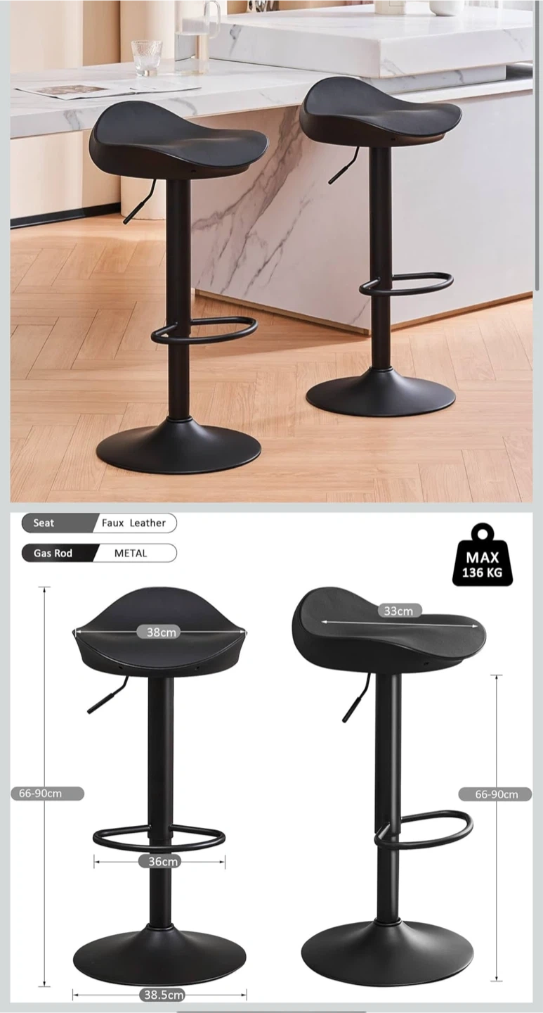 Selling a black bar stool with a faux seat! The gas rod is metal, and it can hold a max weight of 136 kg. The seat is 38cm wide, and the base is 38.5cm in diameter. The height is adjustable from 66-90cm Brand new in box