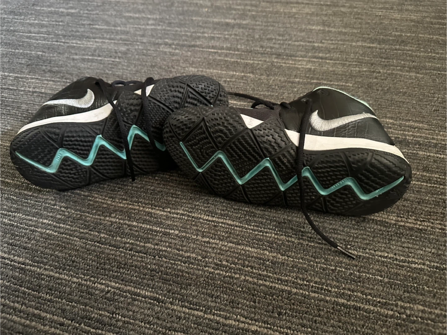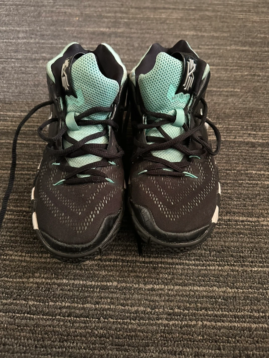 Selling a pair of Nike Kyrie IV basketball shoes. They are black with a teal accent and feature the Nike swoosh logo. Great for playing ball or just wearing around!