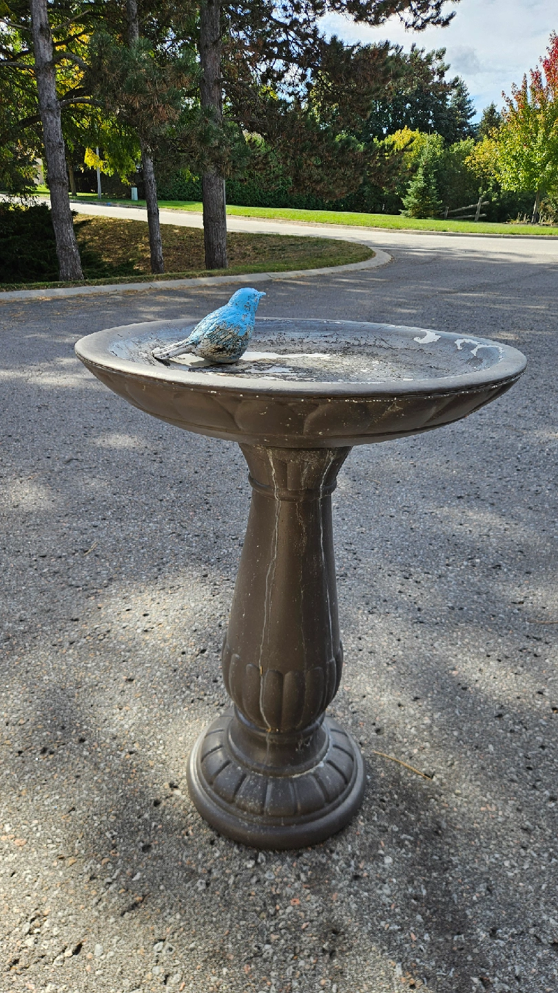 A charming garden bird bath, perfect for attracting feathered friends to your yard! It features a lovely bluebird decoration, adding a touch of whimsy to your outdoor space.