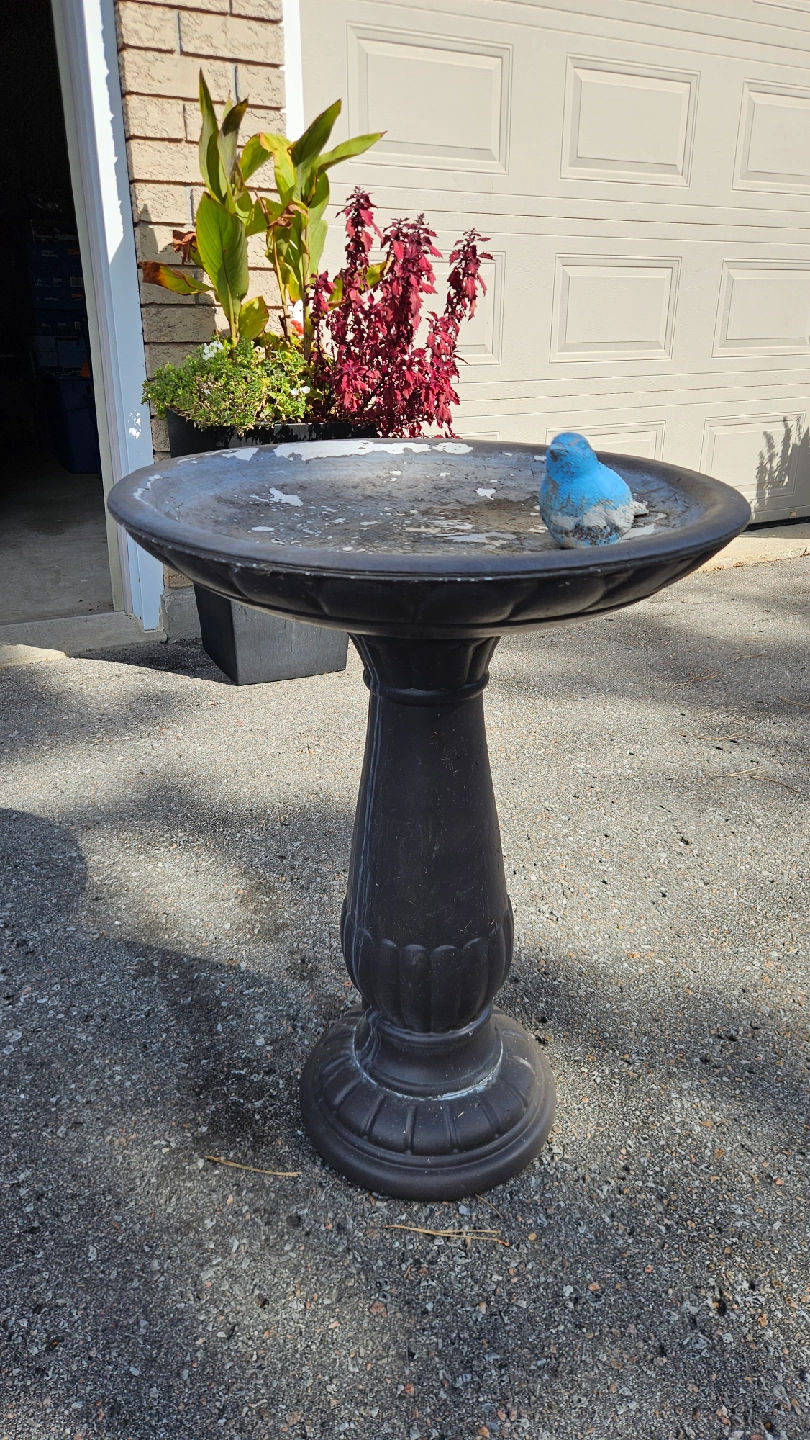 A charming garden bird bath, perfect for attracting feathered friends to your yard! It features a lovely bluebird decoration, adding a touch of whimsy to your outdoor space.