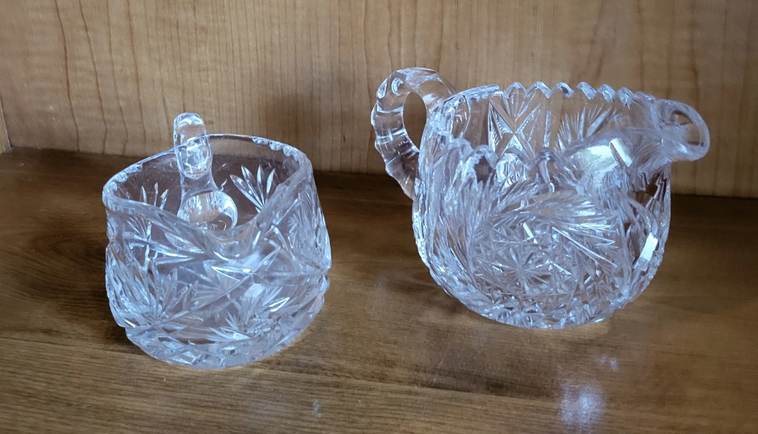 Selling a lovely crystal creamer and sugar bowl set. The intricate designs catch the light beautifully, adding a touch of elegance to any table setting. Perfect for serving cream and sugar with your tea or coffee!