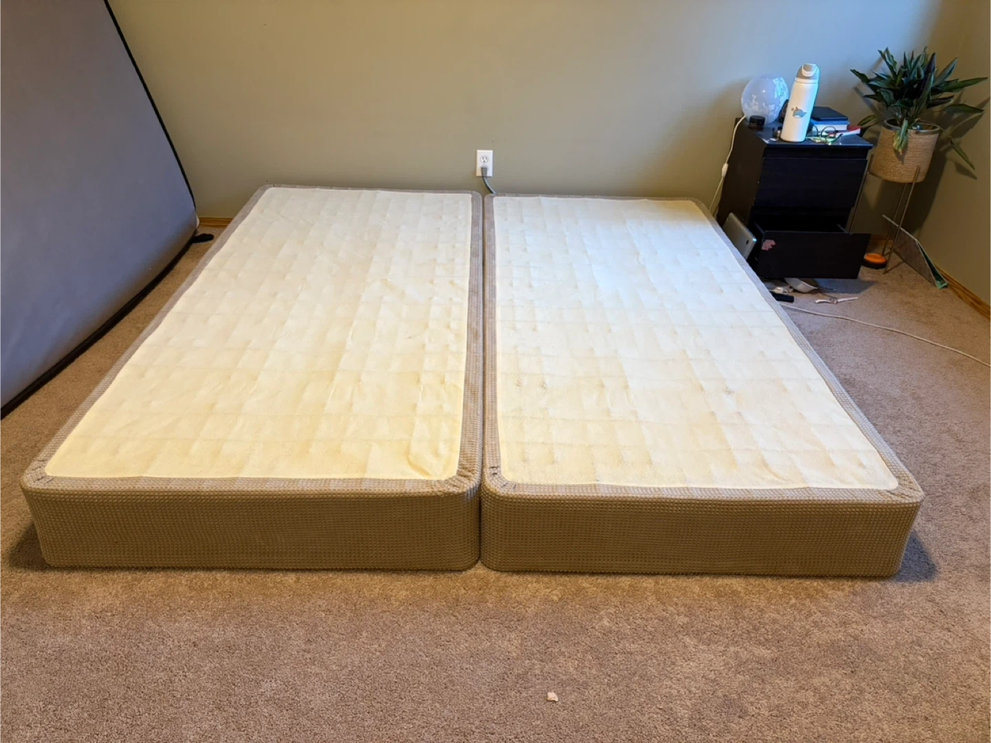 Selling a split box spring bed frame. It's in great shape and ready to support your mattress. Perfect for easy moving and setup!