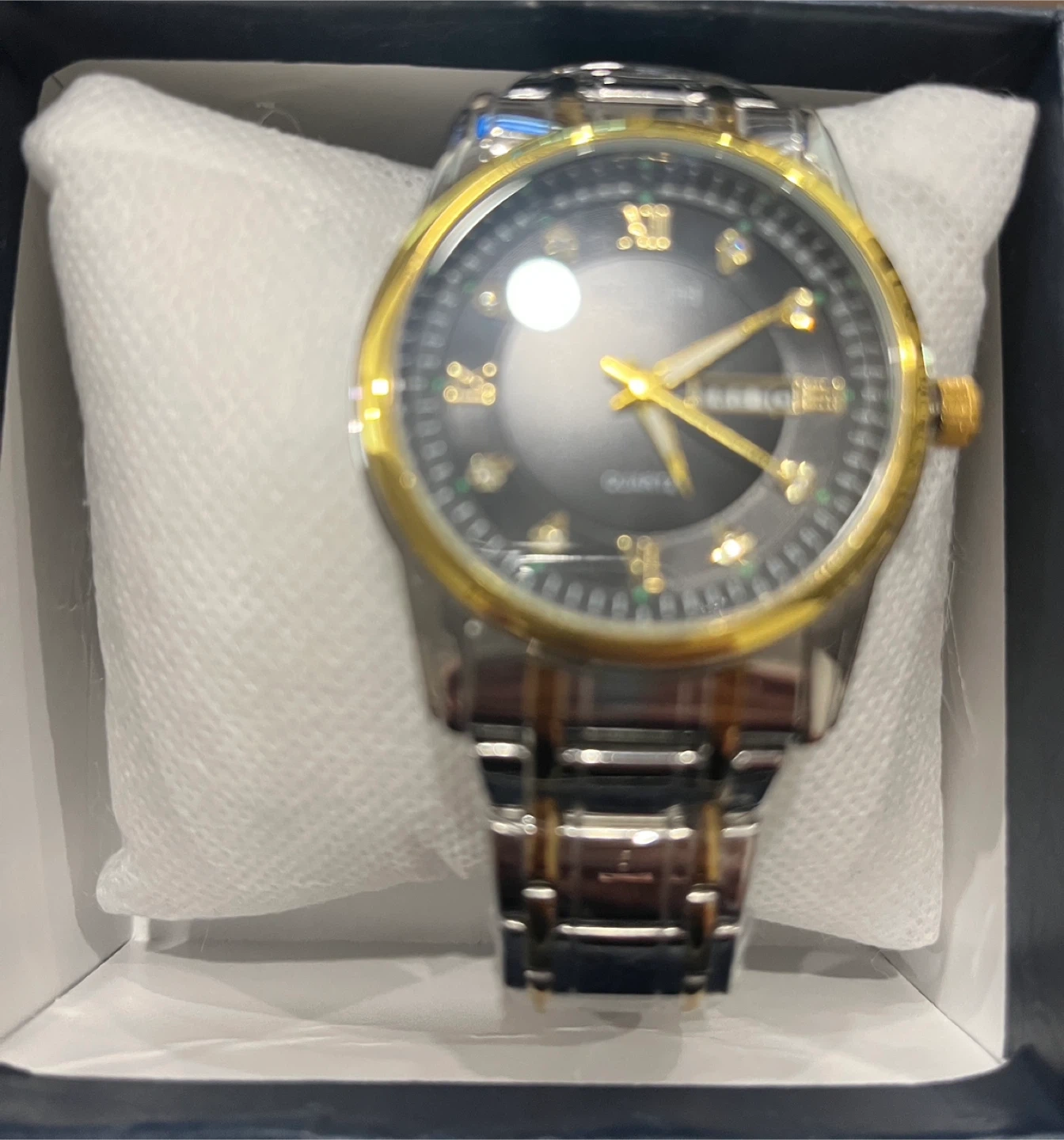 Selling a Wlisth 1853 quartz watch. It comes in its original box and appears to be in great condition! The watch features a black face with gold accents and a two-tone silver and gold band. It's a stylish timepiece!