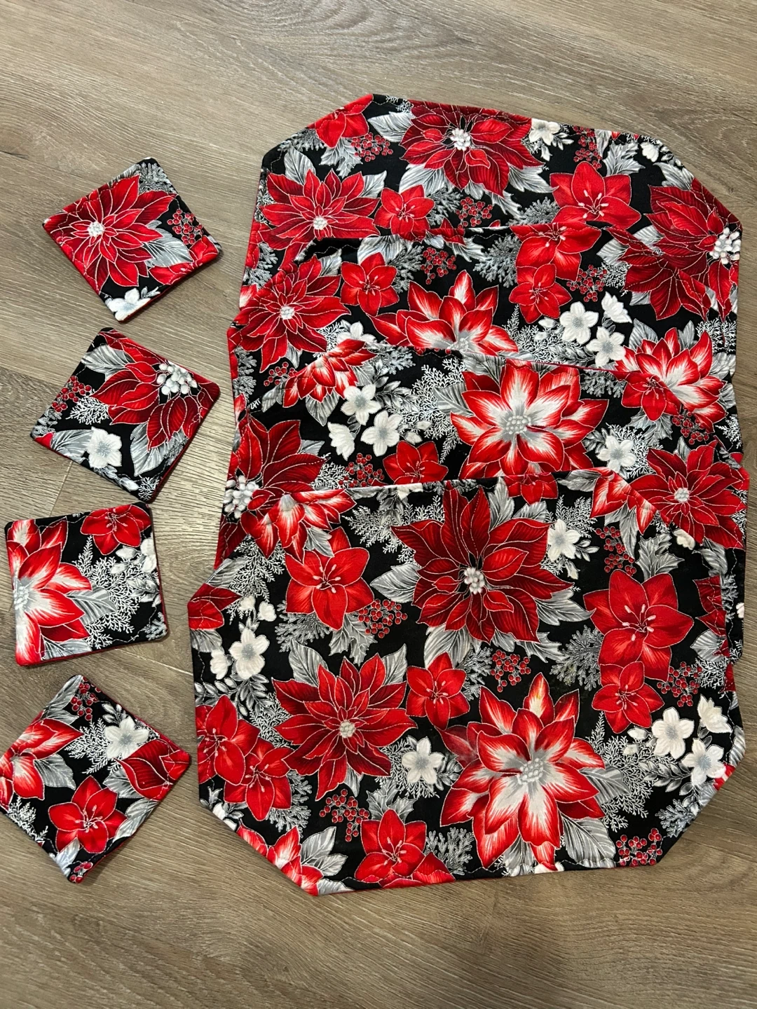 Spruce up your dining table with this set of floral placemats and coasters! The set features a vibrant red and black poinsettia pattern, perfect for adding a touch of festive charm to your home.