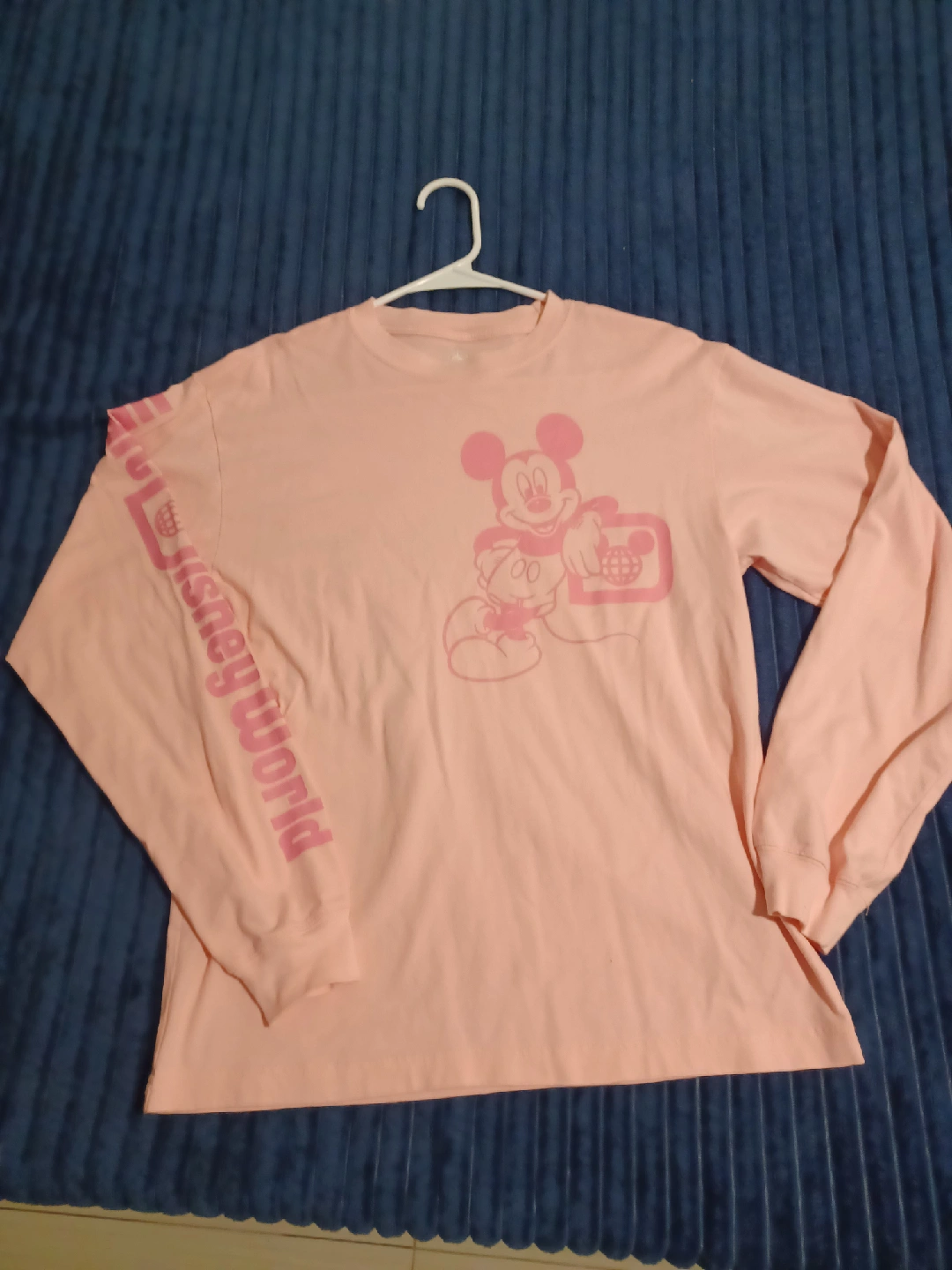 65I'm selling a cute Disney World Mickey Mouse long-sleeved T-shirt. It's a long size and comes in light pink. Perfect for any Disney fan!