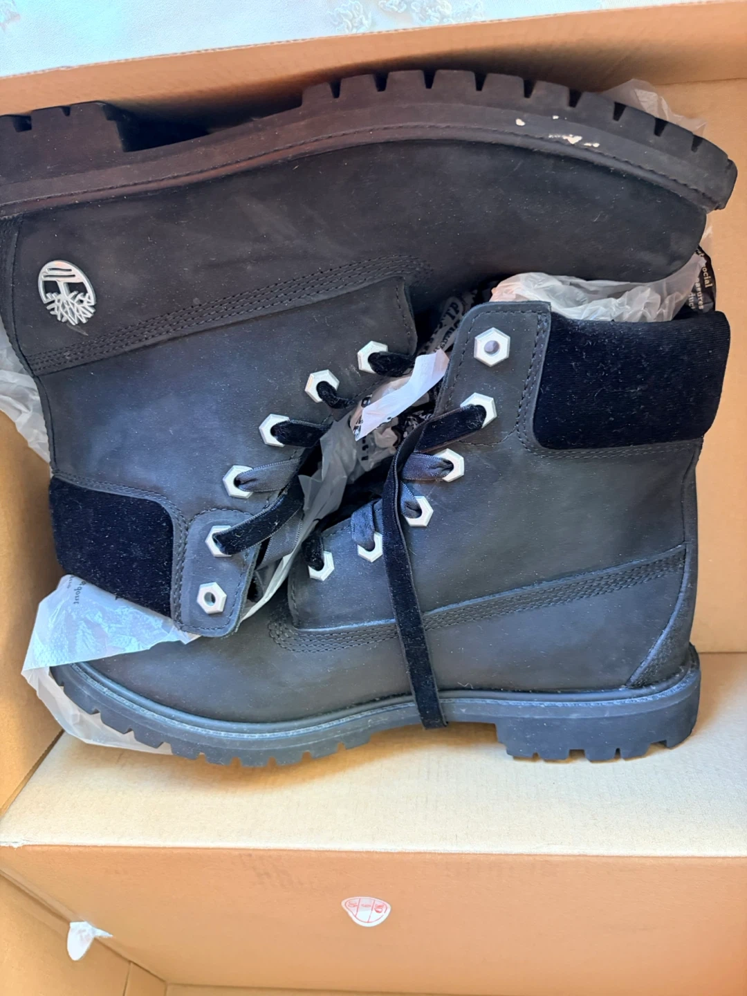 Selling a pair of Timberland 6-inch Premium F/L Black Velvet boots for women. These are a size 9. The model number is TB0A1KHH. They come in the original box. Originally bought for $190. These boots are in great shape and ready for a new home!