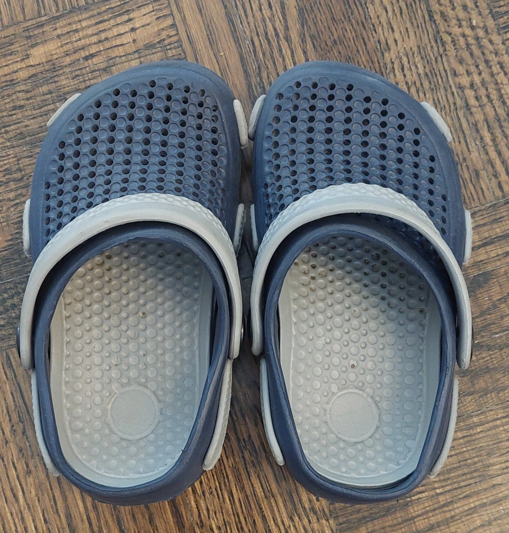 Two pairs of kids clogs available! One pair is black, size 8. The other pair is blue and grey, size 24. Both pairs are in good condition and ready for a new home