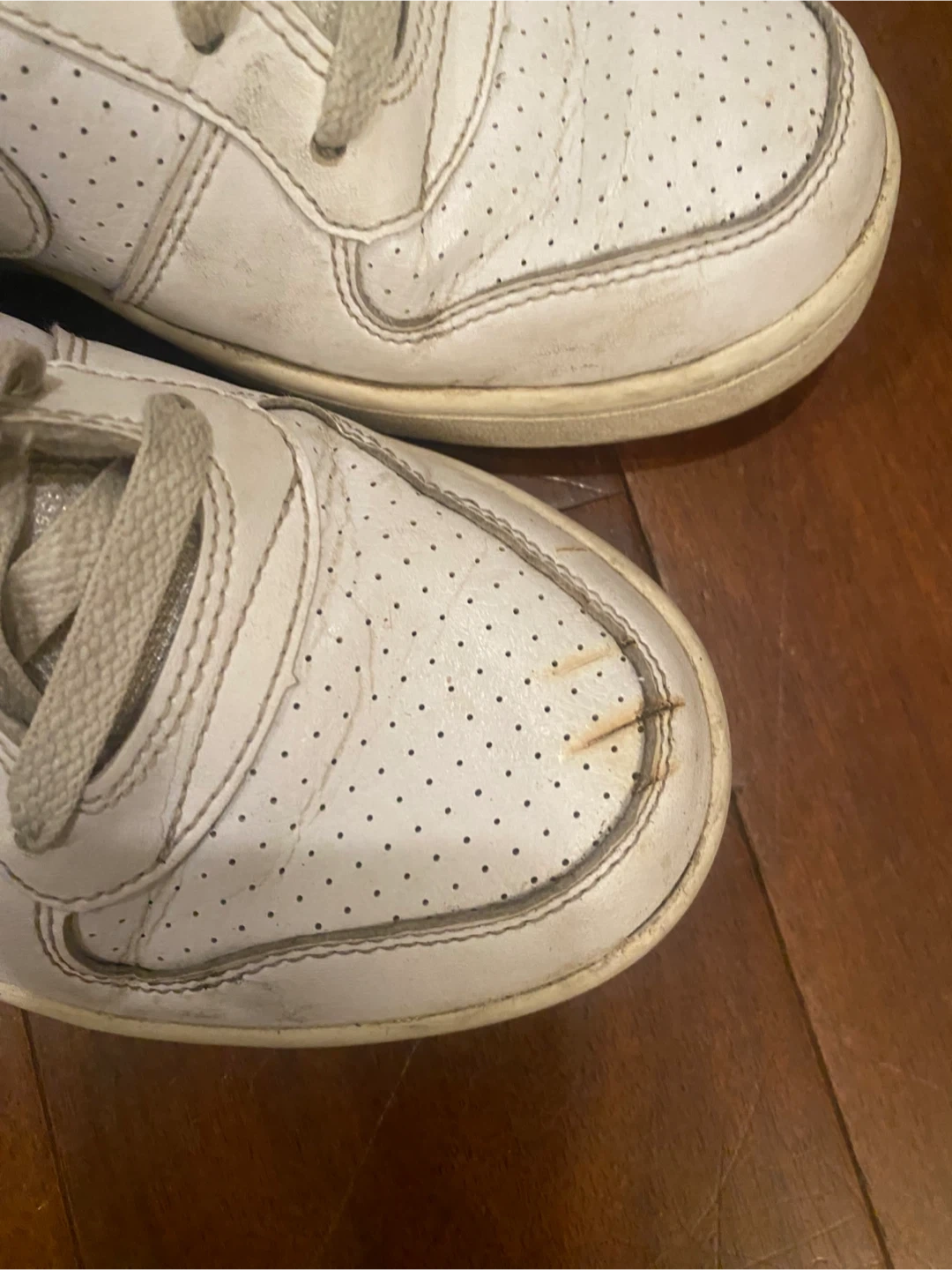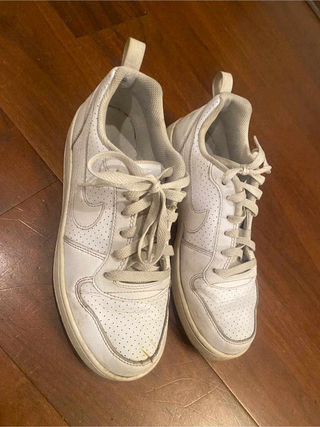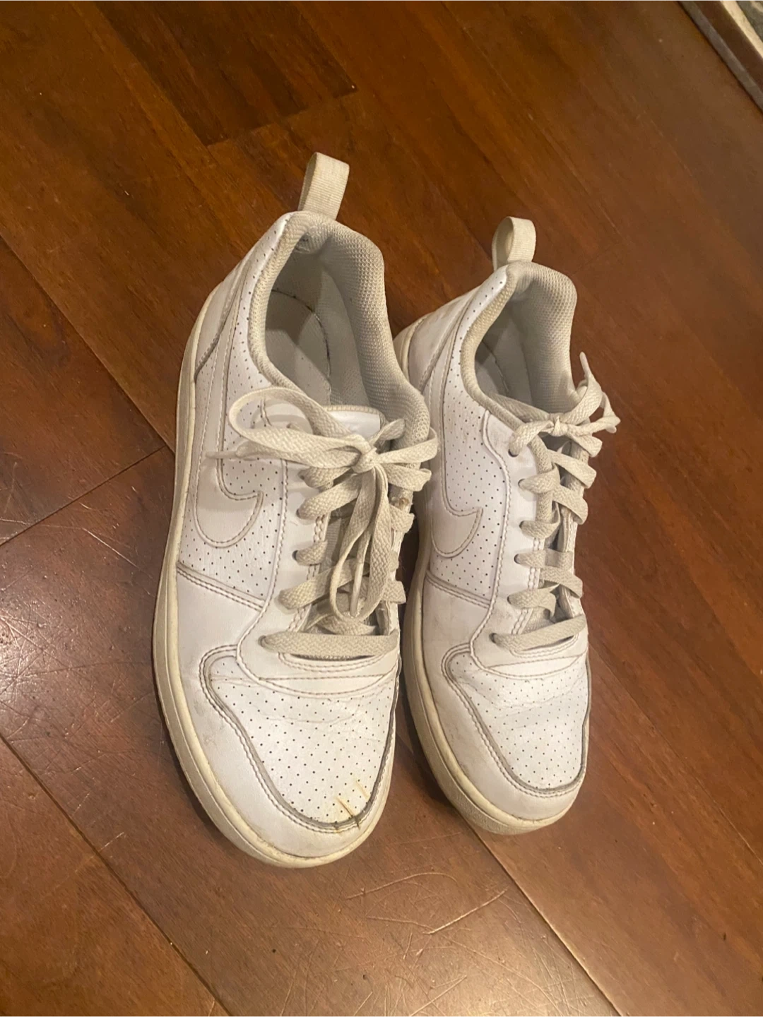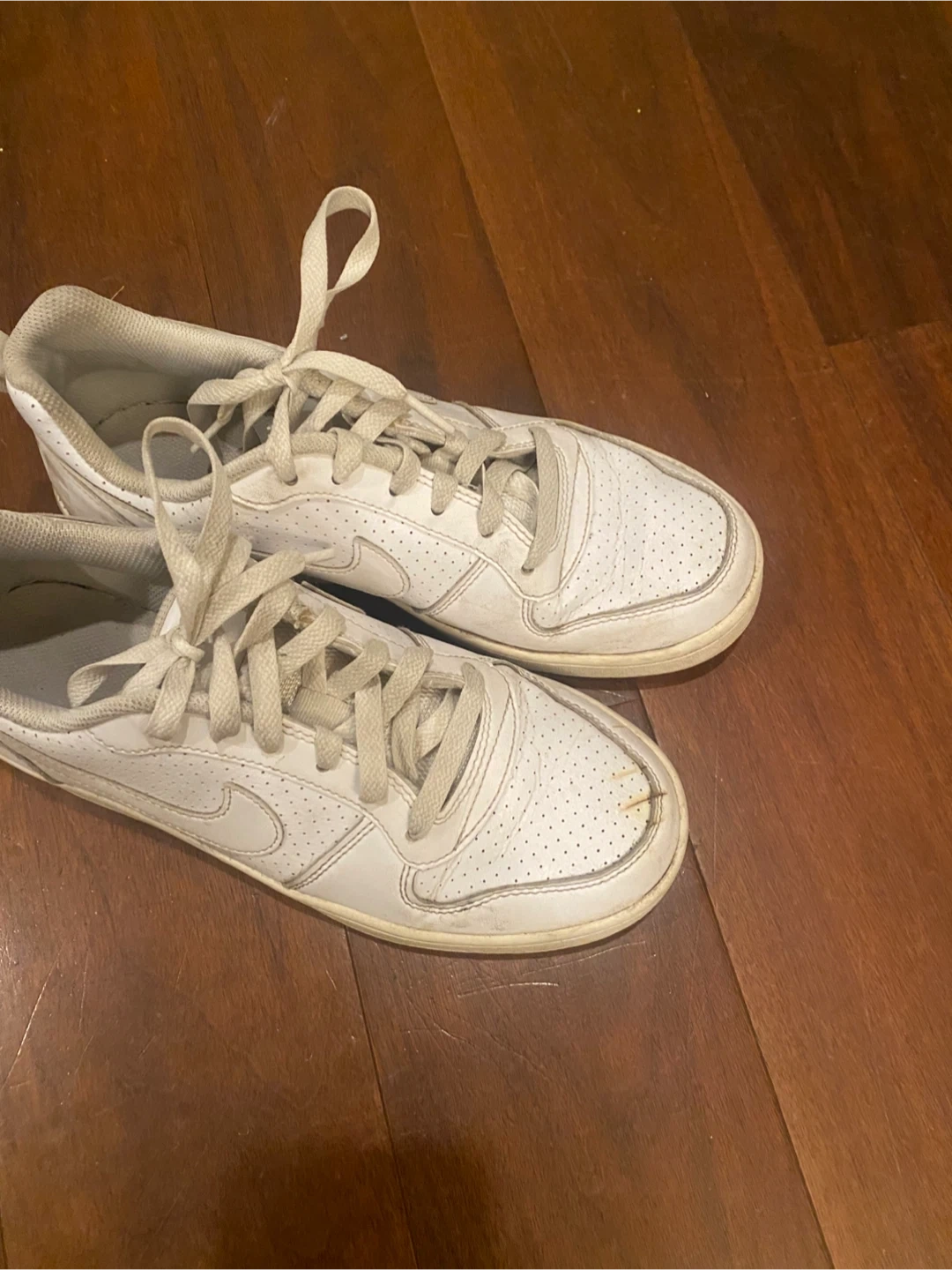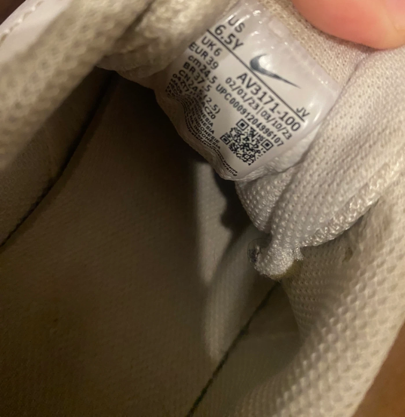 Selling a pair of Nikeair force. There is burn mark visible on front of one shoe as shown. In good condition otherwise just need good wash. Open to offers. Size Us - 6.5Y.