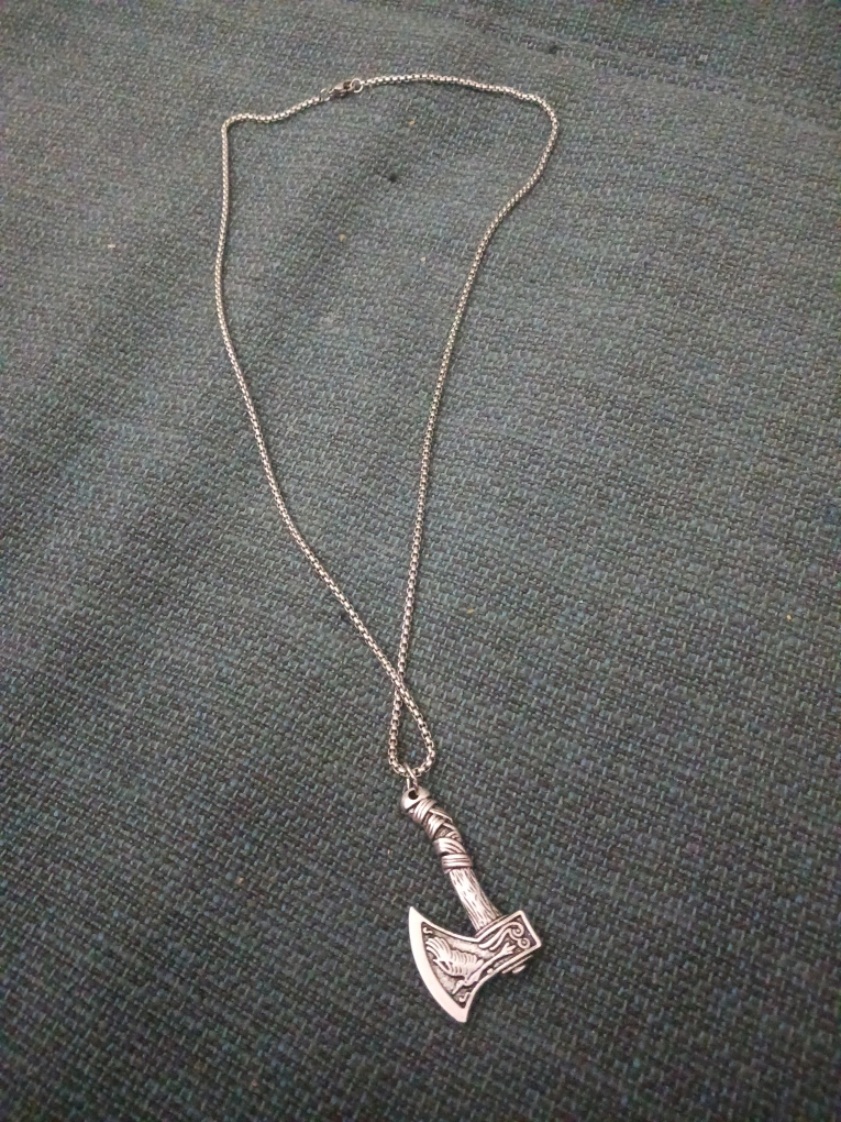 Selling a unique axe pendant necklace. The pendant features an axe design with intricate detailing, giving it a cool and distinctive look. The chain is included and complements the pendant nicely. It's a great accessory to add some edge to your style.