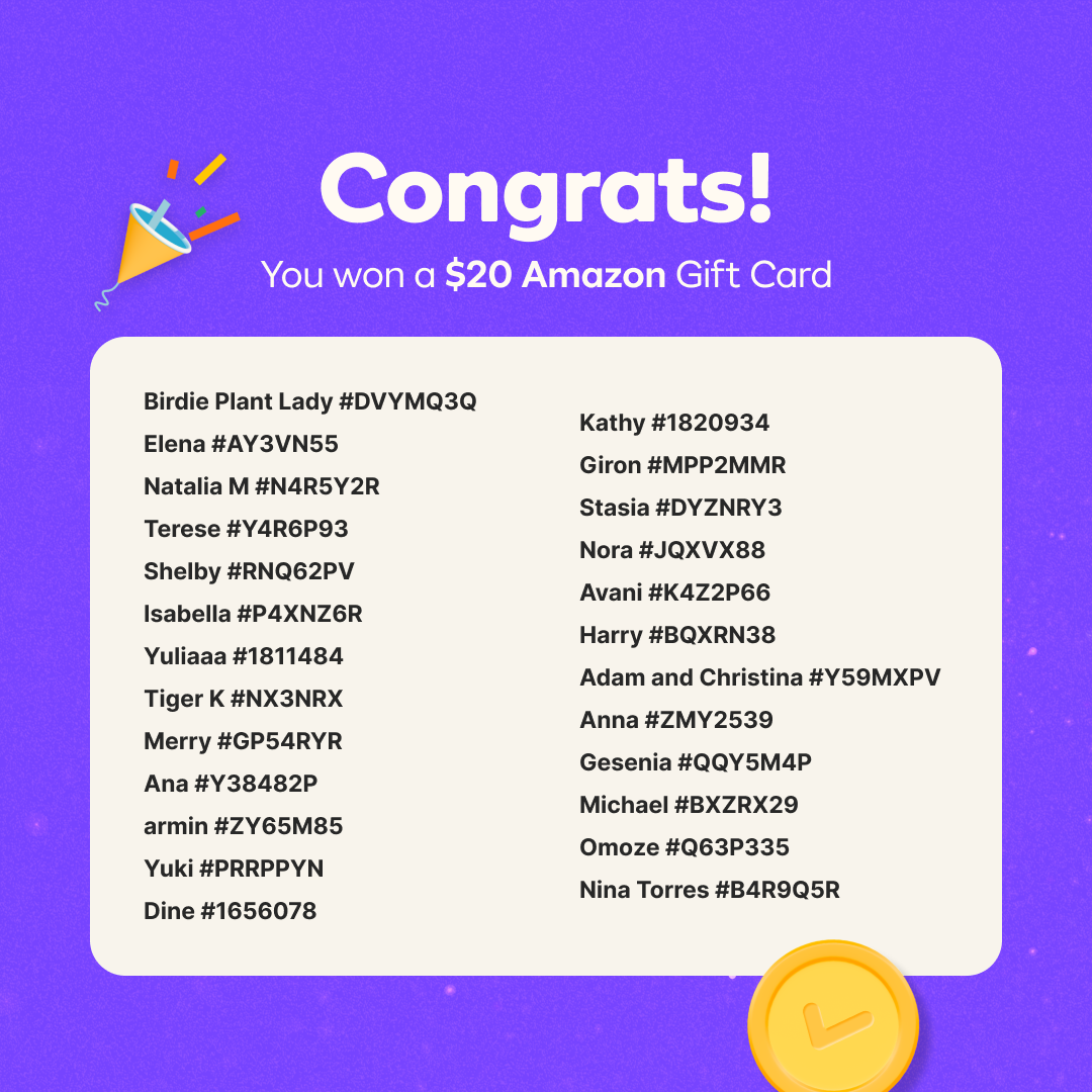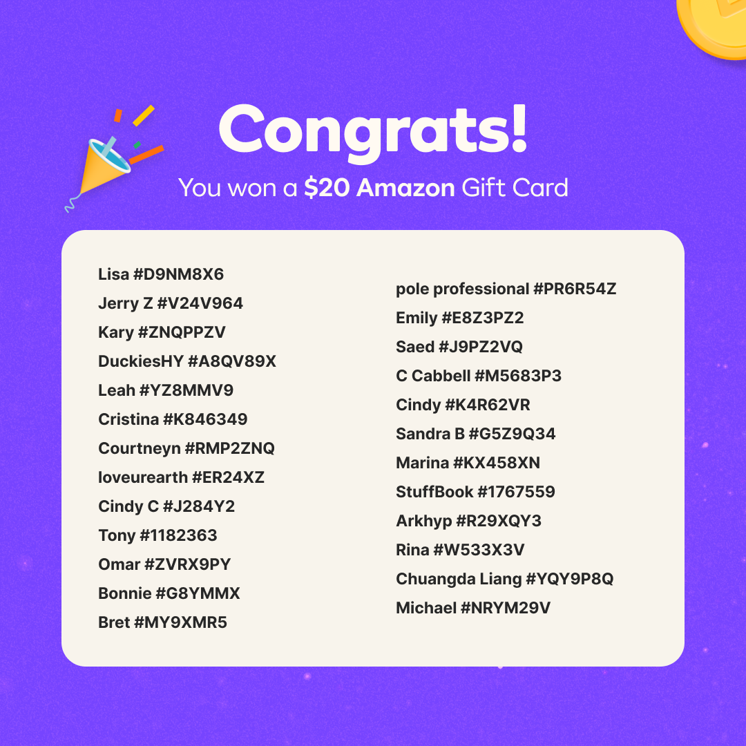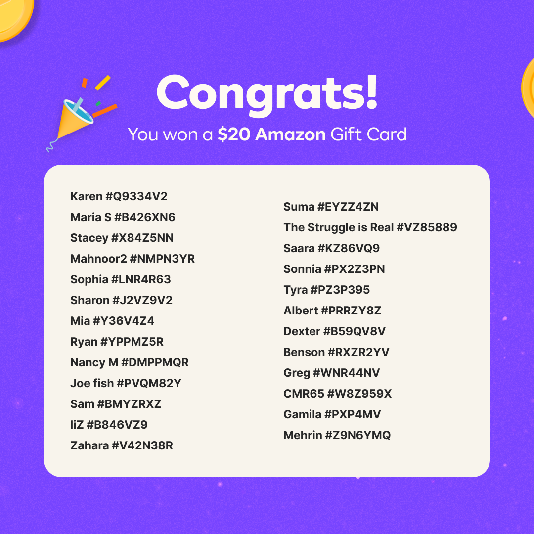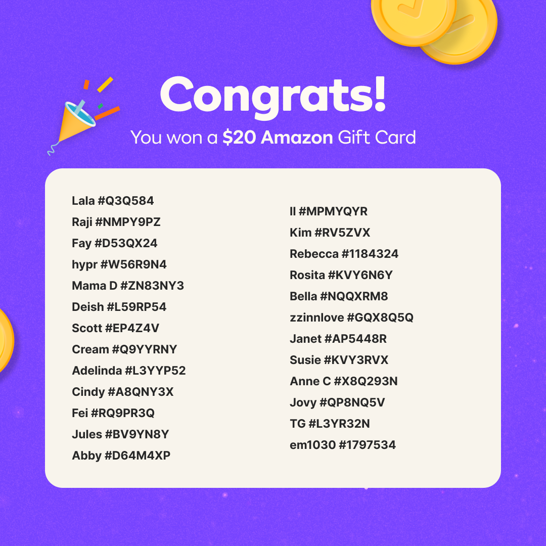 1000+Hey Karroters! Thanks for participating in our October Bingo Event 🖍️! We appreciate everyone who participated this time, and were excited to read all the comments from everyone who posted. Now, for the moment you’ve all been waiting for .... the winners of the Amazon gift cards 🥳 *PLEASE CHECK THE IMAGES ABOVE TO SEE IF YOU WON* Winners 1. Amazon gift card winners - Please check your "My Rewards" section in the app. Gift cards have all been sent out! 2. Some users may share the same name so please check the unique user number. To view your user number go to My Karrot > View profile > 3 dots menu > Copy user info. Our team has already reached out to all winners individually. 3. Share your excitement with the Karrot community in the comments down below! Don’t be discouraged if you didn't win this time, we run events at Karrot very often! Remember that these events are about more than just the rewards. You’re making someone’s day and helping us build a more community-based marketplace. Thanks for tuning in and keep checking Karrot for more events like these 💗
