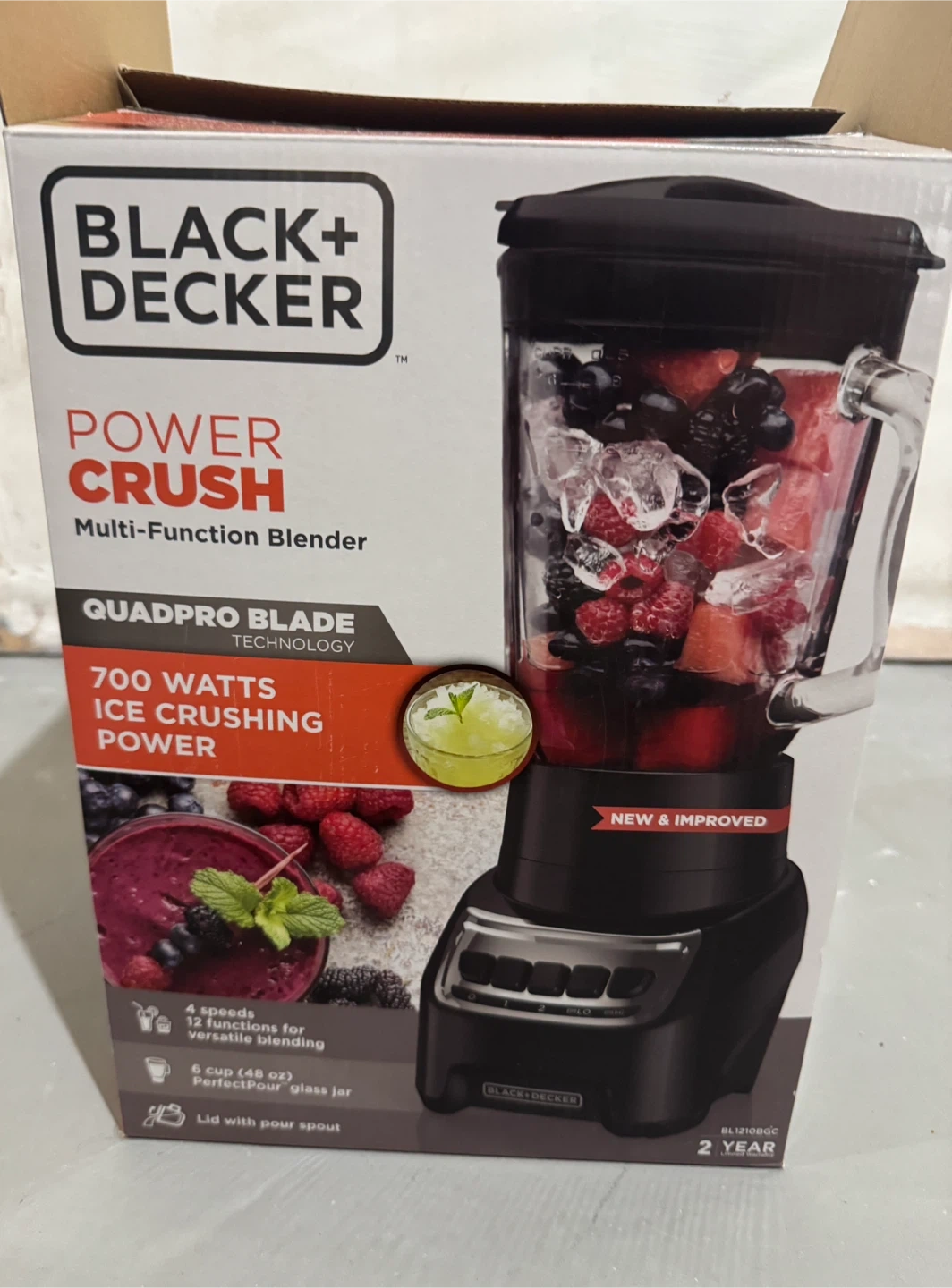 10Used a couple of times Selling a Black+Decker Power Crush multi-function blender! It features Quadpro Blade technology and 700 watts of ice crushing power. It comes with a 6-cup (48 oz) PerfectPour glass jar and a lid with a pour spout. The box is included!