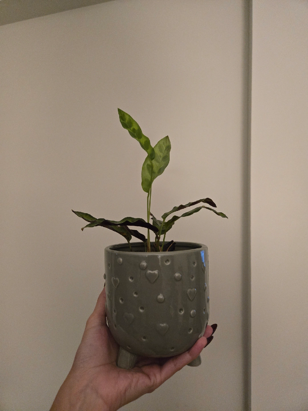 Selling a healthy Calathea plant potted in a cute grey pot with heart details and little feet. It's a lovely addition to any indoor space!