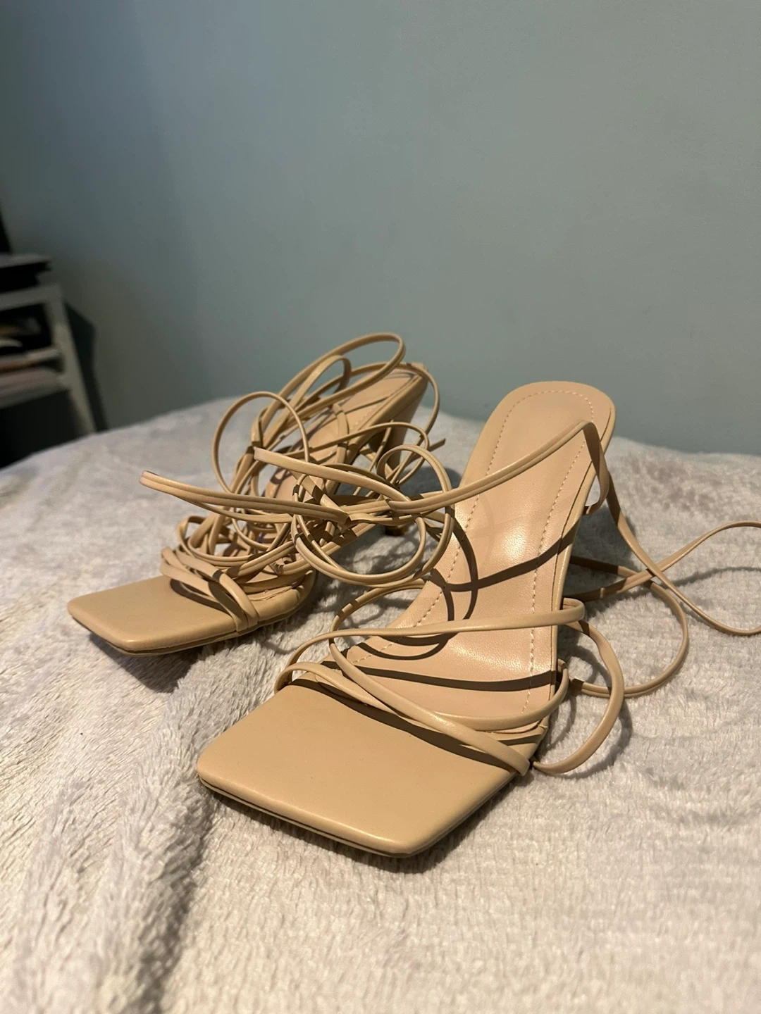 New beige lace-up heels are in great condition and ready for a new home! They feature a stylish square toe and a unique lace-up design that wraps around the ankle. Perfect for dressing up any outfit!
