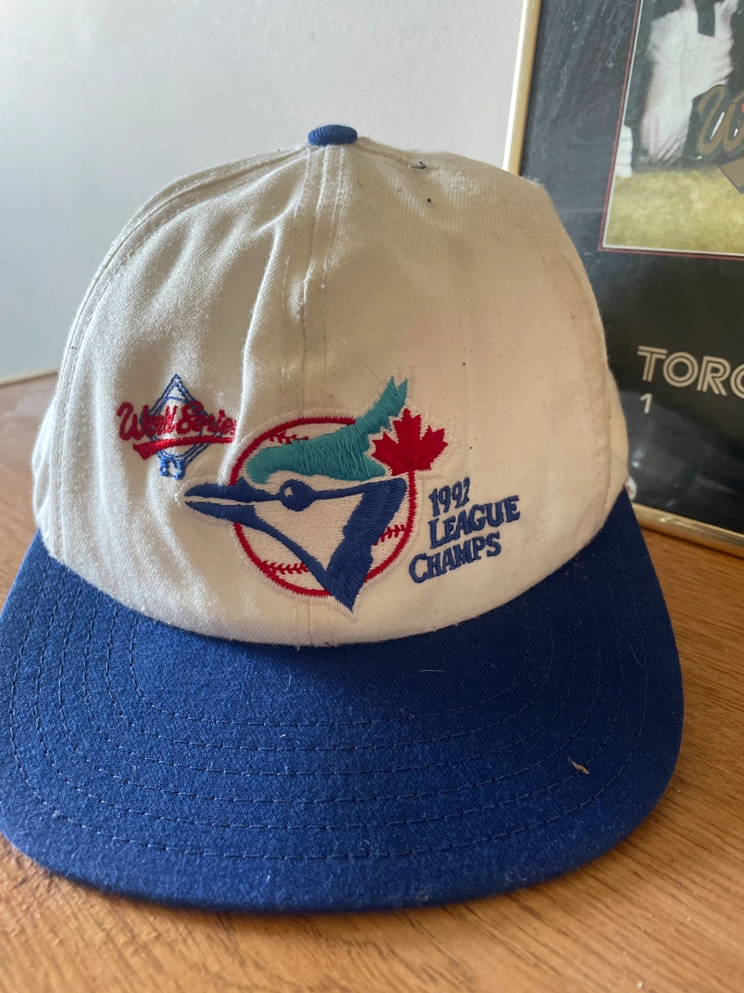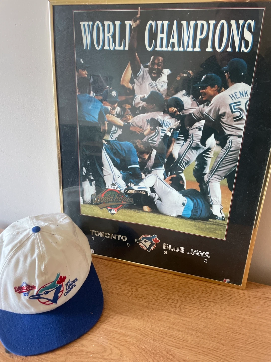 Selling a Toronto Blue Jays 1992 World Series poster in a frame, along with a matching hat! Both items commemorate the Blue Jays' World Series win in 1992. Perfect for any Jays fan!