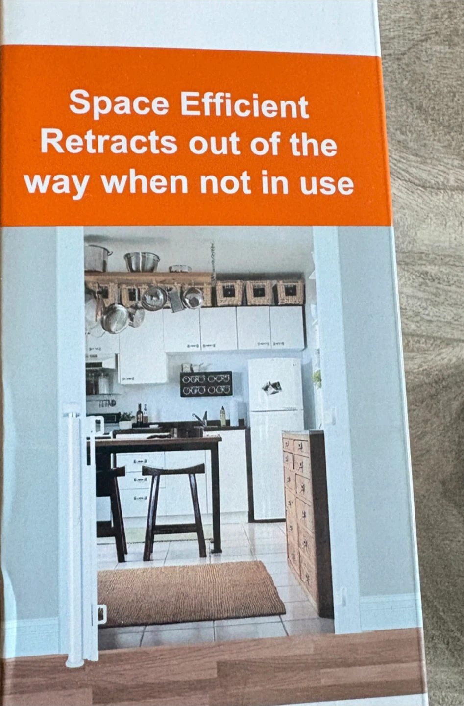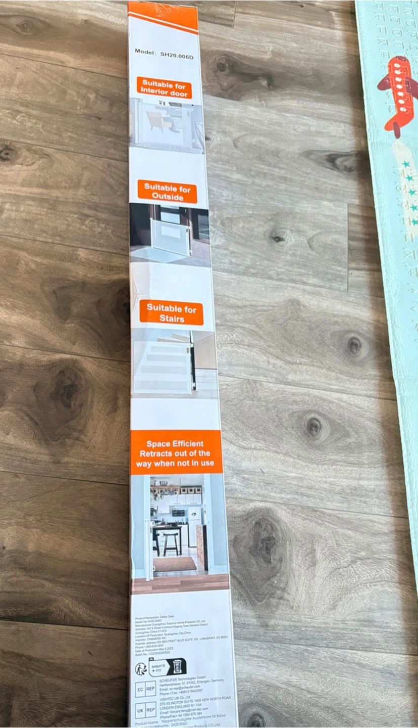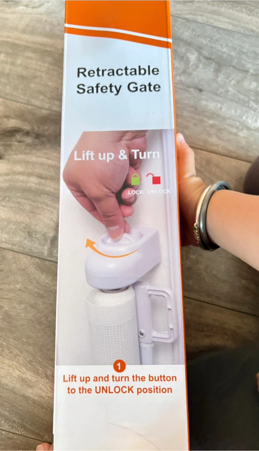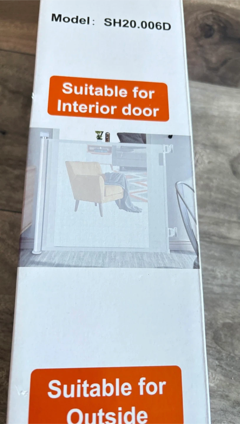 Selling a new retractable safety gate, model SH20.006D. It's suitable for interior doors, outside areas, and even stairs! The gate is designed to be space-efficient, retracting out of the way for baby.Easy to lift up and turn to lock or unlock