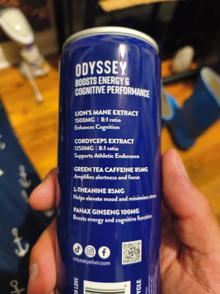 Selling a 12-pack of Odyssey Mushroom Elixir in Blackberry Lemon Twist flavor! This elixir boosts energy and cognitive performance with ingredients like Lion's Mane Extract, Cordyceps Extract, and Green Tea Caffeine. Each can is 12 oz and contains only 25 calories. Perfect for a refreshing and healthy pick-me-up!