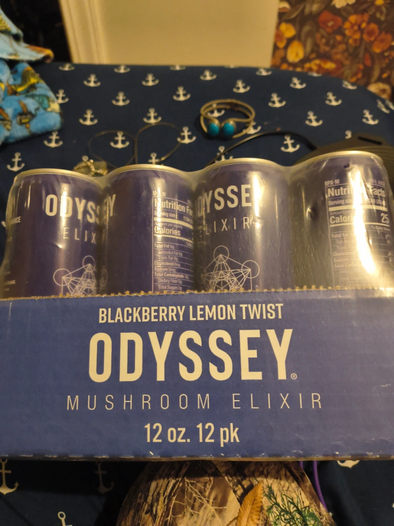 Selling a 12-pack of Odyssey Mushroom Elixir in Blackberry Lemon Twist flavor! This elixir boosts energy and cognitive performance with ingredients like Lion's Mane Extract, Cordyceps Extract, and Green Tea Caffeine. Each can is 12 oz and contains only 25 calories. Perfect for a refreshing and healthy pick-me-up!