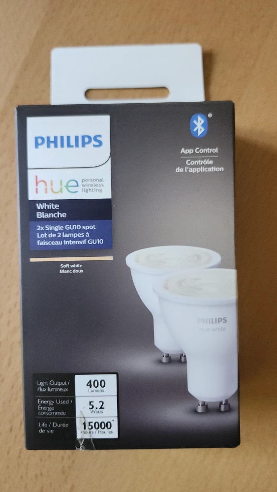 Selling a brand new set of Philips Hue White GU10 spot bulbs. This is a pack of two bulbs, perfect for adding soft white light to any room. They are compatible with the Philips Hue app for easy control. Light output is 400 lumens, and they use 5.2 watts. They have a lifespan of 15000 hours. The box is included!